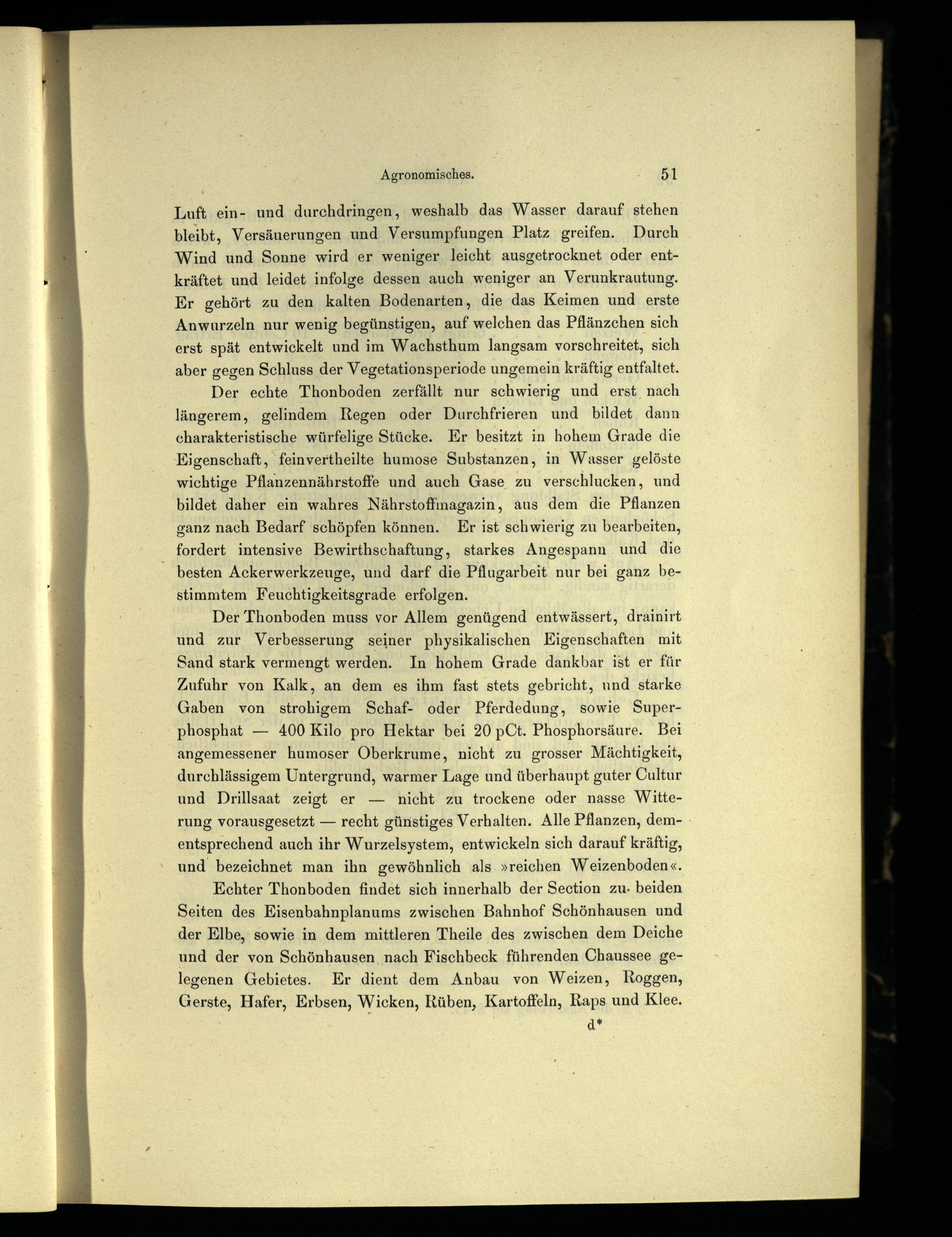 Der Thonboden muss vor Allem genügend entwässert, drainirt und zur Verbesserung seiner physikalischen Eigenschaften mit Sand stark vermengt werden. In hohem Grade dankbar ist er für Zufuhr von Kalk, an dem es ihm fast stets gebricht, und starke Gaben von strohigem Schaf- oder Pferdedung, sowie Superphosphat— 400 Kilo pro Hektar bei 20 pCt. Phosphorsäure. Bei angemessener humoser Oberkrume, nicht zu grosser Mächtigkeit, durchlässigem Untergrund, warmer Lage und überhaupt guter Cultur und Drillsaat zeigt er— nicht zu trockene oder nasse Witterung vorausgesetzt— recht günstiges Verhalten. Alle Pflanzen, dementsprechend auch ihr Wurzelsystem, entwickeln sich darauf kräftig, und bezeichnet man ihn gewöhnlich als»reichen Weizenboden«.