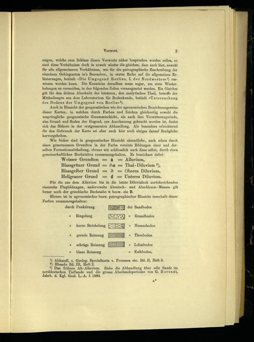 zeigen, welche zum Schluss dieses Vorworts näher besprochen werden sollen, so sind diese Verhältnisse doch in soweit wieder die gleichen, dass auch hier, sowohl für alle allgemeineren Verhältnisse, wie für die petrographische Beschreibung der einzelnen Gebirgsarten in’s Besondere, in erster Reihe auf die allgemeinen Erläuterungen, betitelt»Die Umgegend Berlins, I. der Nordwesten«!) verwiesen werden kann. Die Kenntniss derselben muss sogar, um stete Wiederholungen zu vermeiden, in den folgenden Zeilen vorausgesetzt werden. Ein Gleiches gilt für den dritten Abschnitt der letzteren, den analytischen Theil, betreffs der Mittheilungen aus dem Laboratorium für Bodenkunde, betitelt»Untersuchung des Bodens der Umgegend von Berlin«?%.