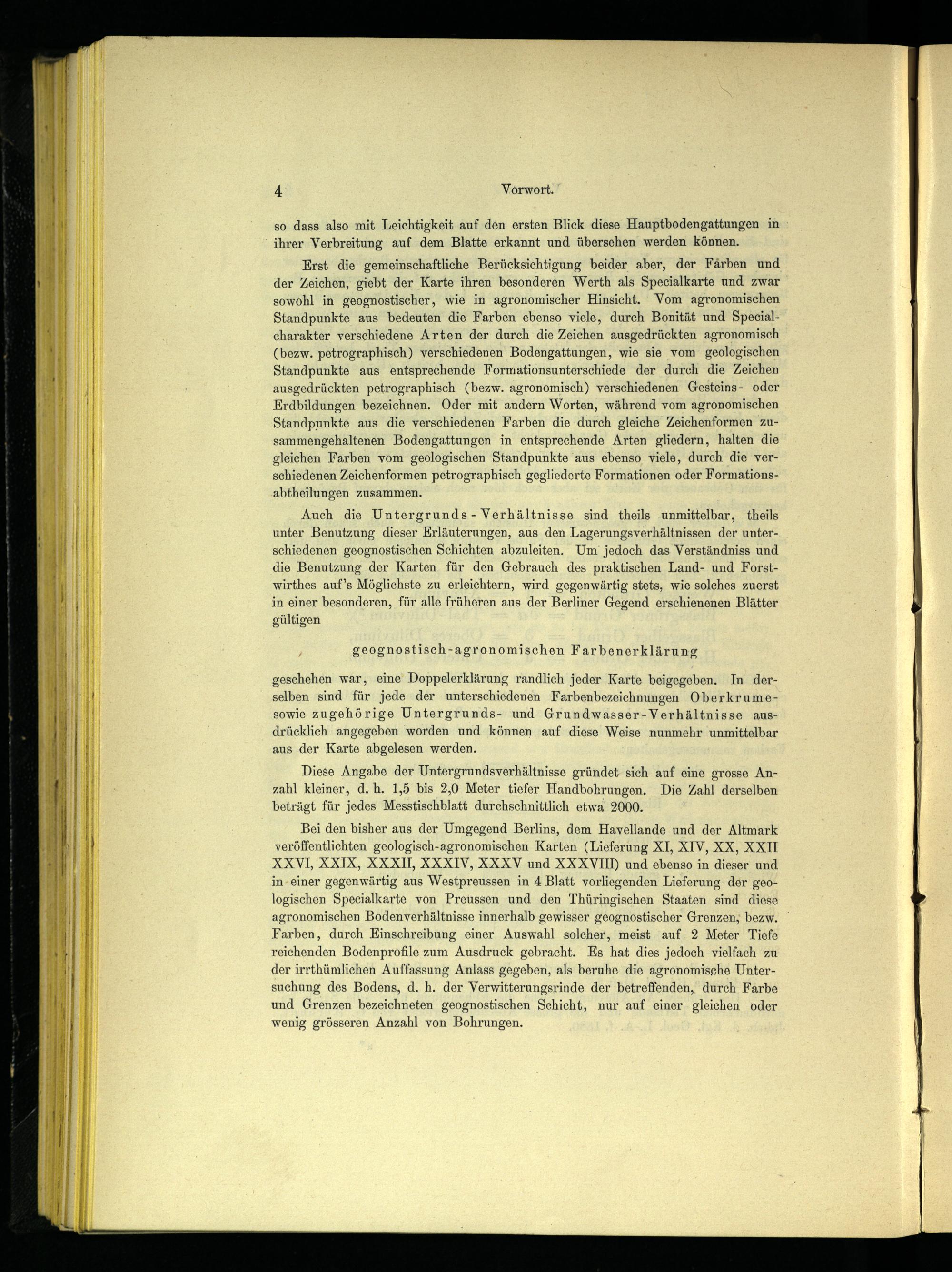 Bei den bisher aus der Umgegend Berlins, dem Havellande und der Altmark veröffentlichten geologisch-agronomischen Karten(Lieferung XI, XIV, XX, XXII XXVI, XXIX, XXXII, XXXIV, XXXV und XXXVIIN und ebenso in dieser und in-einer gegenwärtig aus Westpreussen in 4 Blatt vorliegenden Lieferung der geologischen Specialkarte von Preussen und den Thüringischen Staaten sind diese agronomischen Bodenverhältnisse innerhalb gewisser geognostischer Grenzen, bezw. Farben, durch Einschreibung einer Auswahl solcher, meist auf 2 Meter Tiefe reichenden Bodenprofile zum Ausdruck gebracht. Es hat dies jedoch vielfach zu der irrthümlichen Auffassung Anlass gegeben, als beruhe die agronomische Untersuchung des Bodens, d. h. der Verwitterungsrinde der betreffenden, durch Farbe und Grenzen bezeichneten geognostischen Schicht, nur auf einer gleichen oder wenig grösseren Anzahl von Bohrungen.
