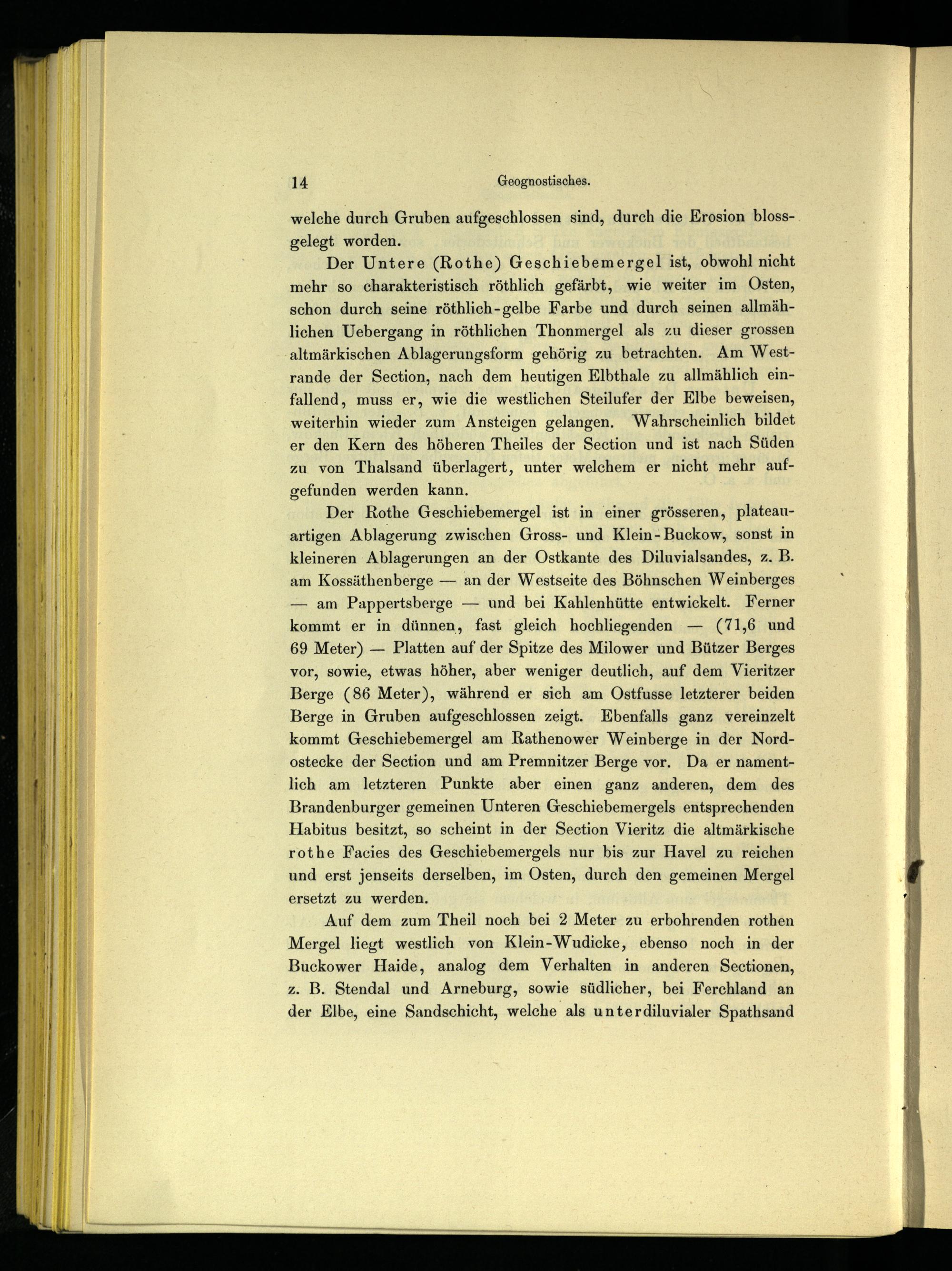 Der Untere(Rothe) Geschiebemergel ist, obwohl nicht mehr so charakteristisch röthlich gefärbt, wie weiter im Osten, schon durch seine röthlich-gelbe Farbe und durch seinen allmählichen Uebergang in röthlichen Thonmergel als zu dieser grossen altmärkischen Ablagerungsform gehörig zu betrachten. Am Westrande der Section, nach dem heutigen Elbthale zu allmählich einfallend, muss er, wie die westlichen Steilufer der Elbe beweisen, weiterhin wieder zum Ansteigen gelangen. Wahrscheinlich bildet er den Kern des höheren Theiles der Section und ist nach Süden zu von Thalsand überlagert, unter welchem er nicht mehr aufgefunden werden kann.