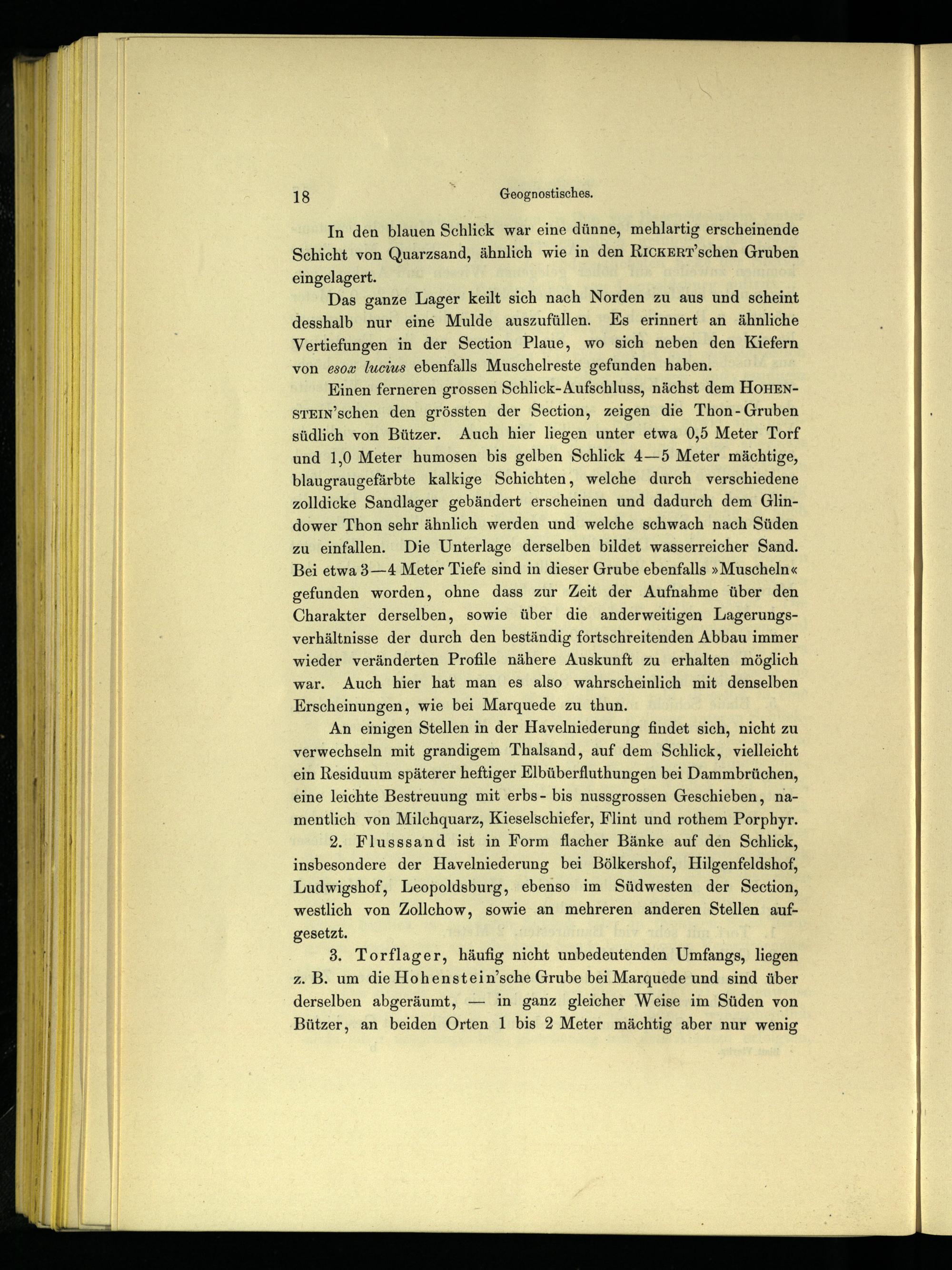 3. Torflager, häufig nicht unbedeutenden Umfangs, liegen z. B. um die Hohenstein’sche Grube bei Marquede und sind über derselben abgeräumt,— in ganz gleicher Weise im Süden von Bützer, an beiden Orten 1 bis 2 Meter mächtig aber nur wenig