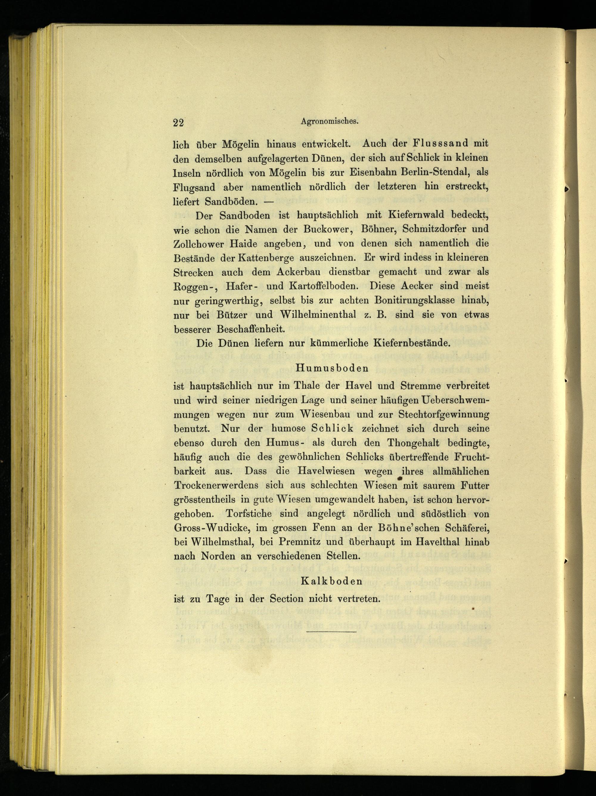 und wird seiner niedrigen Lage und seiner häufigen Ueberschwemmungen wegen nur zum Wiesenbau und zur Stechtorfgewinnung benutzt. Nur der humose Schlick zeichnet sich durch seine ebenso durch den Humus- als durch den Thongehalt bedingte, häufig auch die des gewöhnlichen Schlicks übertreffende Fruchtbarkeit aus. Dass die Havelwiesen wegen ihres allmählichen ; Trockenerwerdens sich aus schlechten Wiesen mit saurem Futter grösstentheils in gute Wiesen umgewandelt haben, ist schon hervorgehoben. Torfstiche sind angelegt nördlich und südöstlich von Gross-Wudicke, im grossen Fenn an der Böhne’schen Schäferei, bei Wilhelmsthal, bei Premnitz und überhaupt im Havelthal hinab nach Norden an verschiedenen Stellen.