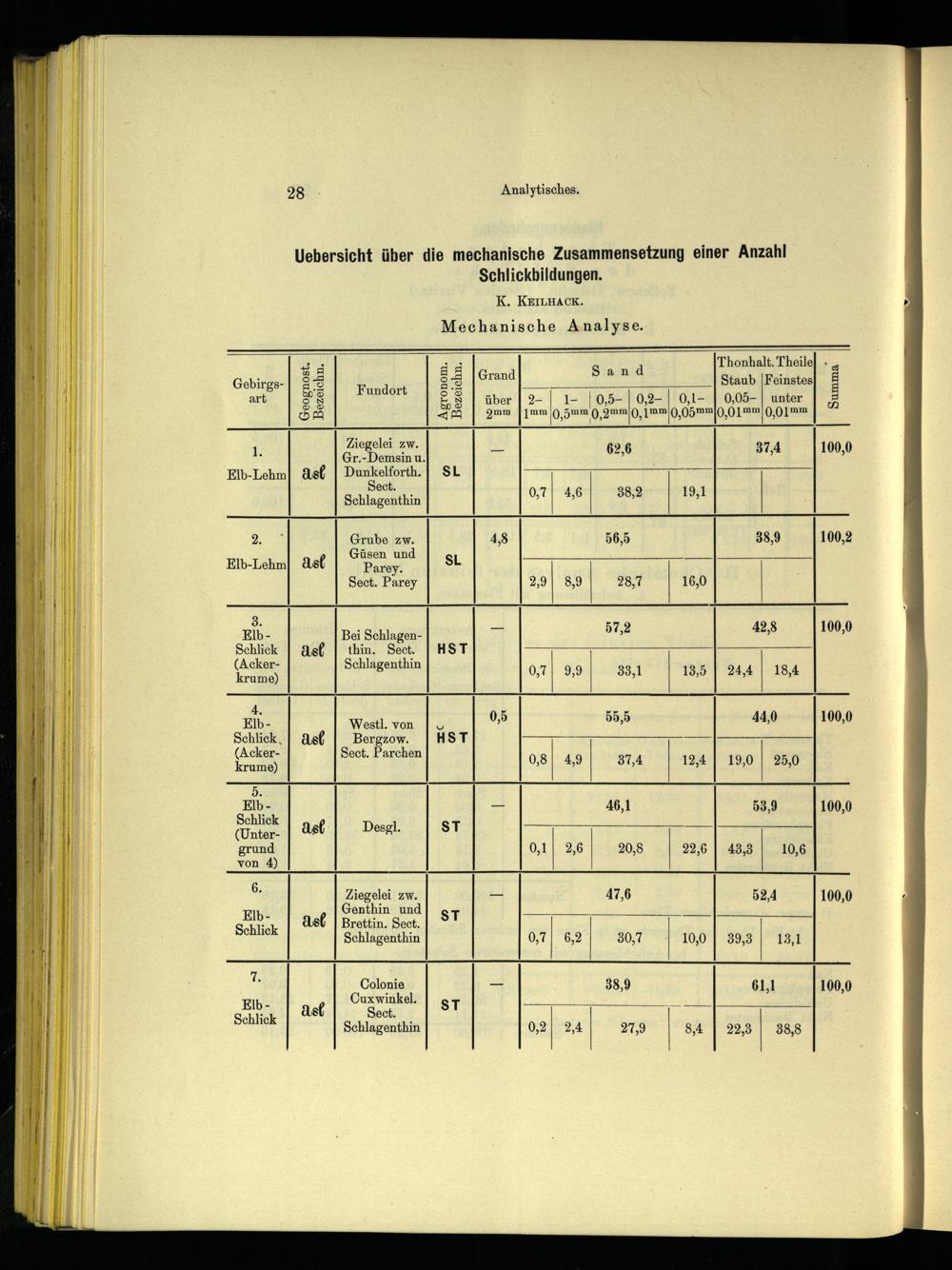 Sand Thonhalt. Theile]+ Grand Staub|Feinstes Ss über] 2-| ı-|0,5-|0,2-| 0,1-| 0,05-| unter|£ gmm|]mm(,5mm Q,9mm 0, mm 0,05mm(0,01 m 0,0 12m SE m REN a SEE SE 1 Ziegelei zw. De> 37.4 100.0 % Gr.-Demsin u.,’, Elb-Lehm| Ast| Dunkelforth.| SL Sect. Schlagenthin