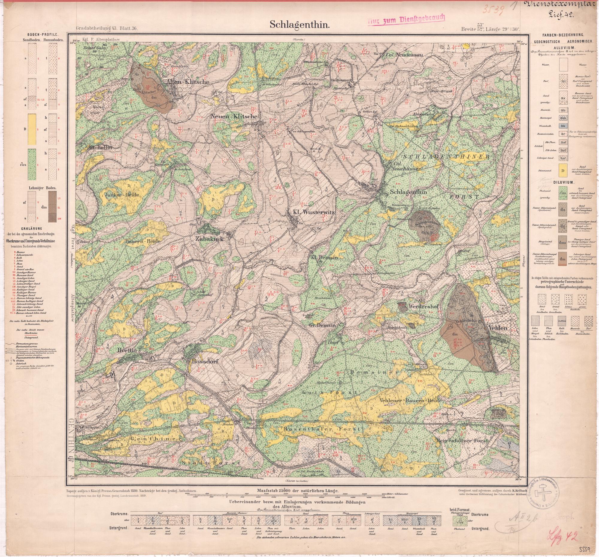 Wasser. Wasser: -. TAN| { möf®/ Z EMS MHumus(Torf) LEN EN 9 VL AUT N———d INZL Her EC LgESN ST; MEERE BL Humoser Sarıd; er Sand. mit durchlässigen Sand- Untergrund S und nahen /(grandig/ Grundwasser: Moorerde. F VA= iS a ES run| Nur In Vebereinanderfölge {;;“A| Zinlagerung vorkommen. 4 FA ; Alb-Thon. Ast.} { Schlick© Lehm. VAR 4 | Elb-Lehm. VS| |* i Sand ZThalsand. Os { schwach humoser Sand \ mit durchlässigem Starıd /Spathsand) SarıdUhterer Dilurialgrand. BEAT „ Spathgrand) Sand-Unte Z { ER KLA RUNG(meist trocken) '-der bei den agronomischen Einschreibungen| ’ für { a1.{ Zhoniger Sand Oberkrume und Untergrunds Verhältnisse Mergelsand bis thonig kalkiger Sand" }(Sechlepp) mit durchlässigen| | benutzten Buchstaben Abkürzungen. Sand-Untergrund. $. Unterer Diluvialmergel Zehmiger Sand |! Infusorienerde 3(Gesechiebernergel) zit schwer durchldssiqgem K Aalk N. einschliesslich seiner LZehm-U{ | s. hm-Untergrund, ; L Zehm 8: g sandigen bei 10-157 |; T Zhon N Verwitterungsrinde. schwer durchlässigem Mergei j G Grand oder Kies} ] SH SandigerHumus j