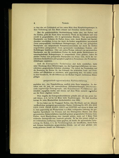 Bei den bisher aus der Umgegend Berlins, dem Havellande und der Altmark veröffentlichten geologisch-agronomischen Karten(Lieferung XI, XIV, XX, XXIII XXWVI, XXIX, XXXII, XXXIV, XXXV und XXXVIII) und ebenso in dieser und in einer gegenwärtig aus Westpreussen in 4 Blatt vorliegenden Lieferung der geologischen Specialkarte von Preussen und den Thüringischen Staaten sind diese agronomischen Bodenverhältnisse innerhalb gewisser geognostischer Grenzen, bezw. Farben, durch Einschreibung einer Auswahl solcher, meist auf 2 Meter Tiefe reichenden Bodenprofile zum Ausdruck gebracht... Es hat dies jedoch vielfach zu der irrthümlichen Auffassung Anlass gegeben, als beruhe die agronomische Untersuchung des Bodens, d. h. der Verwitterungsrinde der betreffenden, durch Farbe und Grenzen bezeichneten geognostischen Schicht, nur auf einer gleichen oder wenig grösseren Anzahl von Bohrungen.