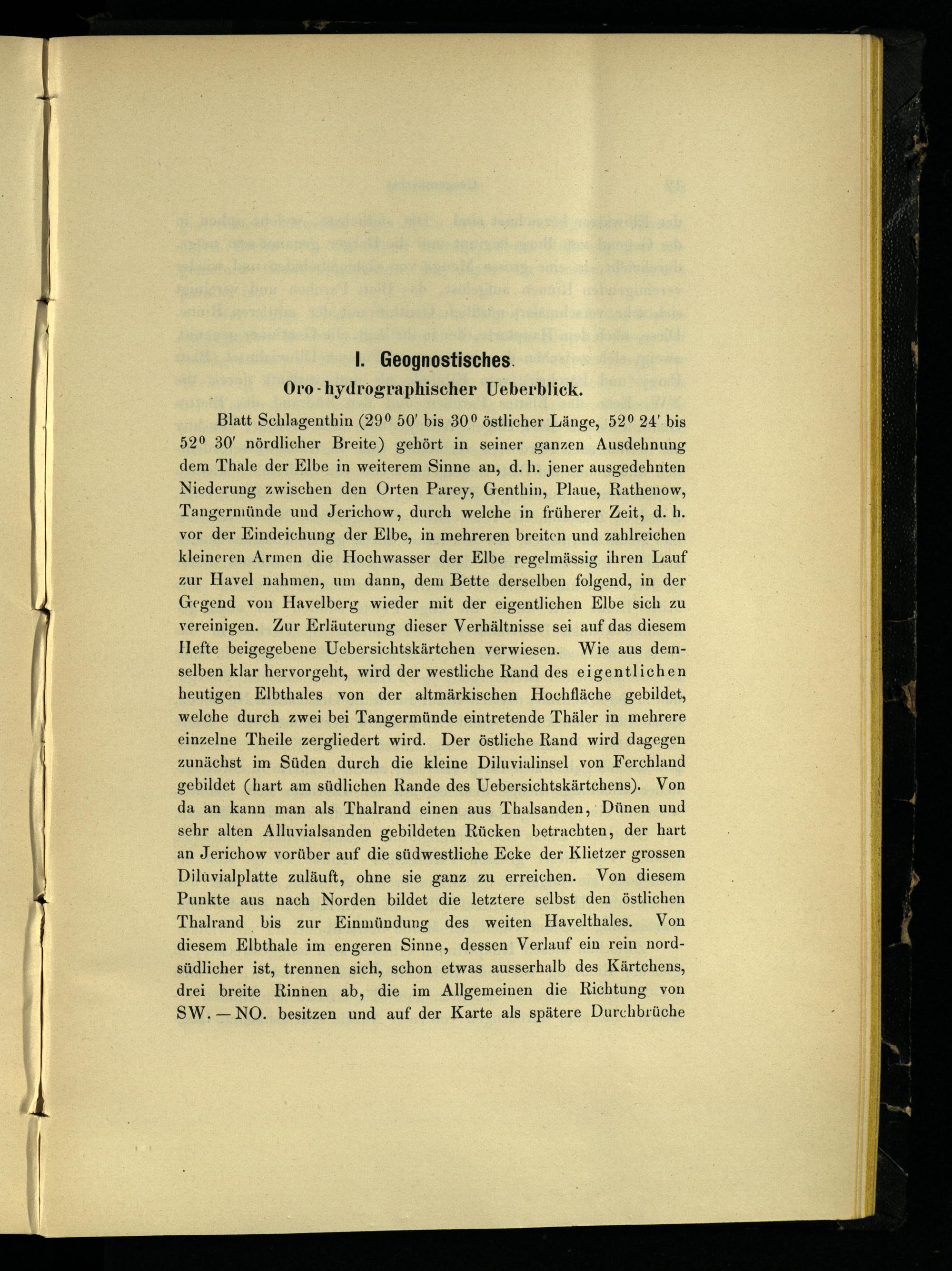 Blatt Schlagenthin(29° 50’ bis 30° östlicher Länge, 52° 24’ bis 529 30' nördlicher Breite) gehört in seiner ganzen Ausdehnung dem Thale der Elbe in weiterem Sinne an, d. h. jener ausgedehnten Niederung zwischen den Orten Parey, Genthin, Plaue, Rathenow, Tangermünde und Jerichow, durch welche in früherer Zeit, d. bh. vor der Eindeichung der Elbe, in mehreren breiten und zahlreichen kleineren Armen die Hochwasser der Elbe regelmässig ihren Lauf zur Havel nahmen, um dann, dem Bette derselben folgend, in der Gegend von Havelberg wieder mit der eigentlichen Elbe sich zu vereinigen. Zur Erläuterung dieser Verhältnisse sei auf das diesem Hefte beigegebene Uebersichtskärtchen verwiesen. Wie aus demselben klar hervorgeht, wird der westliche Rand des eigentlichen heutigen Elbthales von der altmärkischen Hochfläche gebildet, welche durch zwei bei Tangermünde eintretende Thäler in mehrere einzelne Theile zergliedert wird. Der östliche Rand wird dagegen zunächst im Süden durch die kleine Diluvialinsel von Ferchland gebildet(hart am südlichen Rande des Uebersichtskärtchens). Von da an kann man als Thalrand einen aus T’halsanden, Dünen und sehr alten Alluvialsanden gebildeten Rücken betrachten, der hart an Jerichow vorüber auf die südwestliche Ecke der Klietzer grossen Dilüvialplatte zuläuft, ohne sie ganz zu erreichen. Von diesem Punkte aus nach Norden bildet die letztere selbst den östlichen Thalrand bis zur Einmündung des weiten Havelthales. Von diesem Elbthale im engeren Sinne, dessen Verlauf ein rein nordsüdlicher ist, trennen sich, schon etwas ausserhalb des Kärtchens, drei breite Rinnen ab, die im Allgemeinen die Richtung von SW.—NO. besitzen und auf der Karte als spätere Durchbrüche