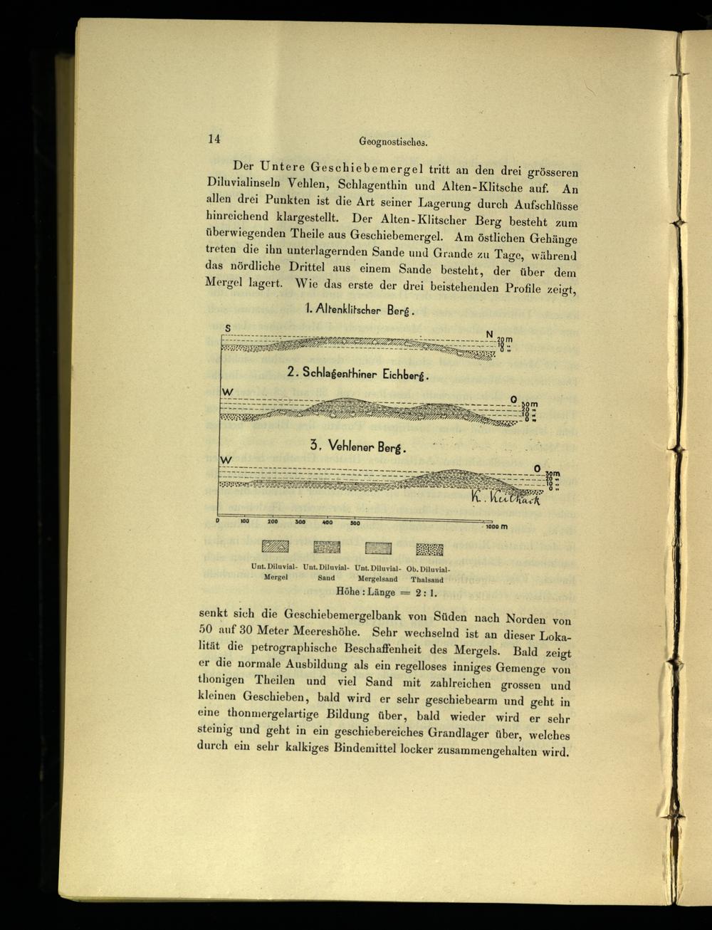 Der Untere Geschiebemergel tritt an den drei grösseren Diluvialinseln Vehlen, Schlagenthin und Alten-Klitsche auf. An allen drei Punkten ist die Art seiner Lagerung durch Aufschlüsse hinreichend klargestellt. Der Alten- Klitscher Berg besteht zum überwiegenden Theile aus Geschiebemergel. Am östlichen Gehänge treten die ihn unterlagernden Sande und Grande zu Tage, während das nördliche Drittel aus einem Sande besteht, der über dem Mergel lagert. Wie das erste der drei beistehenden Profile zeigt,