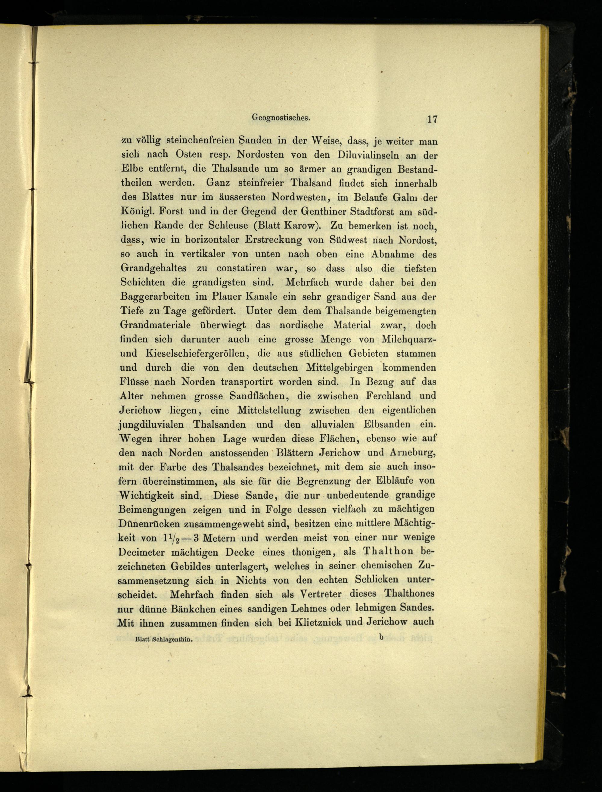 zu völlig steinchenfreien Sanden in der Weise, dass, je weiter man sich nach Osten resp. Nordosten von den Diluvialinseln an der Elbe entfernt, die Thalsande um so ärmer an grandigen Bestandtheilen werden. Ganz steinfreier Thalsand findet sich innerhalb des Blattes nur im äussersten Nordwesten, im Belaufe Galm ‚der Königl. Forst und in der Gegend der Genthiner Stadtforst am südlichen Rande der Schleuse(Blatt Karow). Zu bemerken ist noch, dass, wie in horizontaler Erstreckung von Südwest nach Nordost, so auch in vertikaler von unten nach oben eine Abnahme des Grandgehaltes zu constatiren war, so dass also die tiefsten Schichten die grandigsten sind. Mehrfach wurde daher bei den Baggerarbeiten im Plauer Kanale ein sehr grandiger Sand aus der Tiefe zu Tage gefördert. Unter dem dem Thalsande beigemengten Grandmateriale überwiegt das nordische Material zwar, doch finden sich darunter auch eine grosse Menge von Milchquarzund Kieselschiefergeröllen, die aus südlichen Gebieten stammen und durch die von den deutschen Mittelgebirgen kommenden Flüsse nach Norden transportirt worden sind. In Bezug auf das Alter nehmen grosse Sandflächen, die zwischen Ferchland und Jerichow liegen, eine Mittelstellung zwischen den eigentlichen jungdiluvialen Thalsanden und den alluvialen Elbsanden ein. Wegen ihrer hohen Lage wurden diese Flächen, ebenso wie auf den nach Norden anstossenden Blättern Jerichow und Arneburg, mit der Farbe des Thalsandes bezeichnet, mit dem sie auch insofern ‚übereinstimmen, als sie für die Begrenzung der Elbläufe von Wichtigkeit sind. Diese Sande, die nur unbedeutende grandige Beimengungen zeigen und in Folge dessen vielfach zu mächtigen Dünenrücken zusammengeweht sind, besitzen eine mittlere Mächtigkeit von 11/9—3 Metern und werden meist von einer nur Wenige Decimeter mächtigen Decke eines thonigen, als Thalthon bezeichneten Gebildes unterlagert, welches in seiner. chemischen Zusammensetzung sich. in Nichts von den echten Schlicken unterscheidet. Mehrfach finden sich als Vertreter dieses Thalthones nur dünne Bänkchen eines sandigen Lehmes oder lehmigen Sandes. Mit ihnen zusammen finden sich bei Klietznick und Jerichow auch b