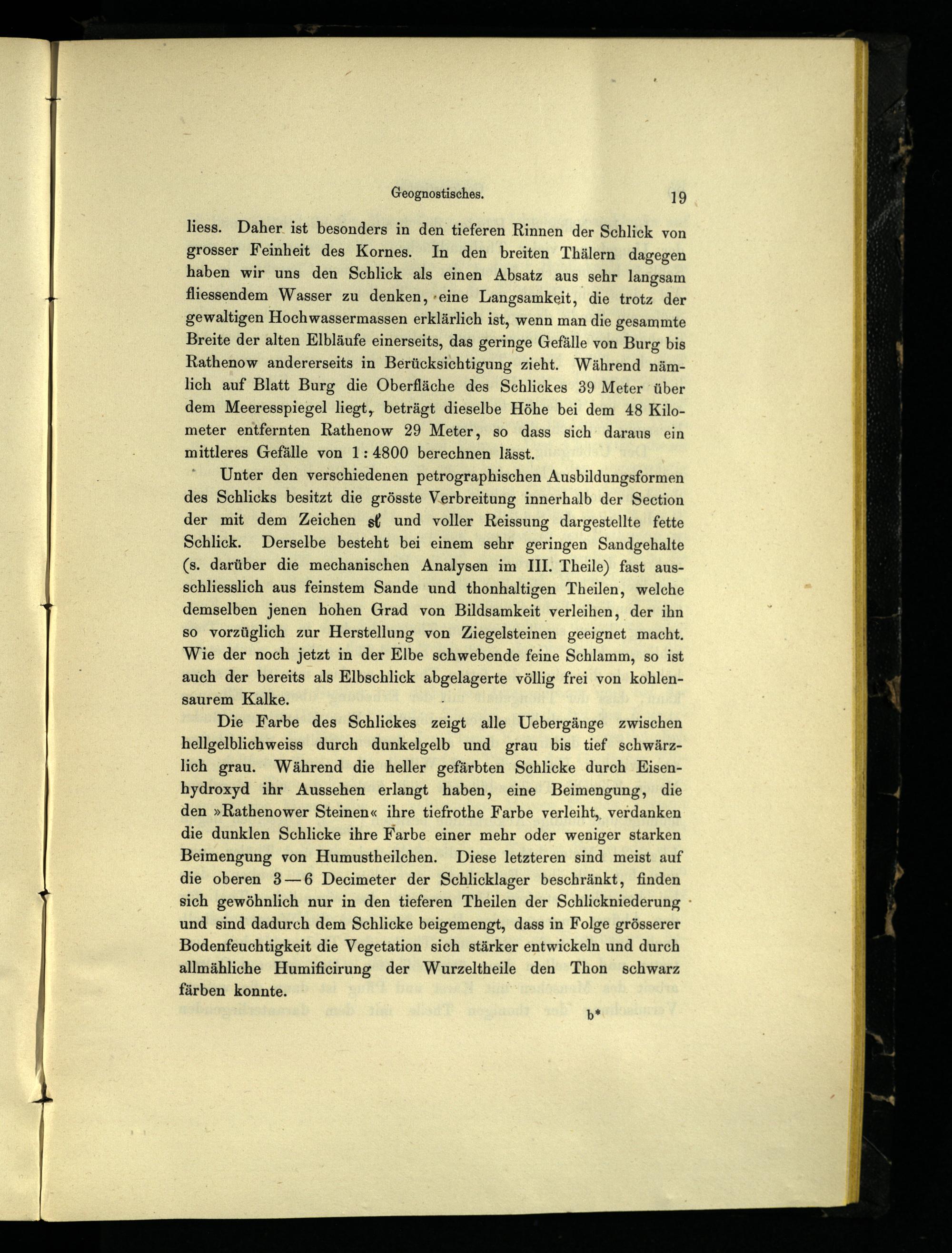 Die Farbe des Schlickes zeigt alle Uebergänge zwischen hellgelblichweiss durch dunkelgelb und grau bis tief schwärzlich grau. Während die heller gefärbten Schlicke durch Eisenhydroxyd ihr. Aussehen erlangt haben, eine Beimengung, die den»Rathenower Steinen« ihre tiefrothe Farbe verleiht, verdanken die dunklen Schlicke ihre Farbe einer mehr oder weniger starken Beimengung von Humustheilchen. Diese letzteren sind meist auf die oberen 3—6 Decimeter der Schlicklager beschränkt, finden sich gewöhnlich nur in den tieferen Theilen der Schlickniederung und sind dadurch dem Schlicke beigemengt, dass in Folge grösserer Bodenfeuchtigkeit die Vegetation sich stärker entwickeln und durch allmähliche Humificirung der Wurzeltheile den Thon schwarz färben konnte.