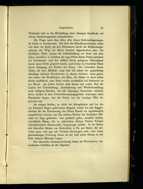 An einigen Stellen, so dicht bei Altenplathow und bei der zur Domaine Hagen gehörenden Ziegelei, wurde bei den Baggerarbeiten für die Erweiterung des Plauer Kanals ein eigenthümlich ausgebildetes Gestein aus den tiefsten Theilen der Genthiner Elbrinne zu Tage gefördert: eine grünlich gelbe,.ziemlich leichte, zerreibliche Masse, die in zahlreichen kleinen Partien Vivianit (phosphorsaures Eisenoxydul) beigemengt enthält. In ihr finden sich bisweilen Stücke von Birkenholz, z. Th. mit Rinde, die entweder ganz und gar mit Vivianit durchzogen sind, oder einen gleichmässigen Ueberzug dieses an der Luft schön blauen, in der Erde weissen Minerals tragen.