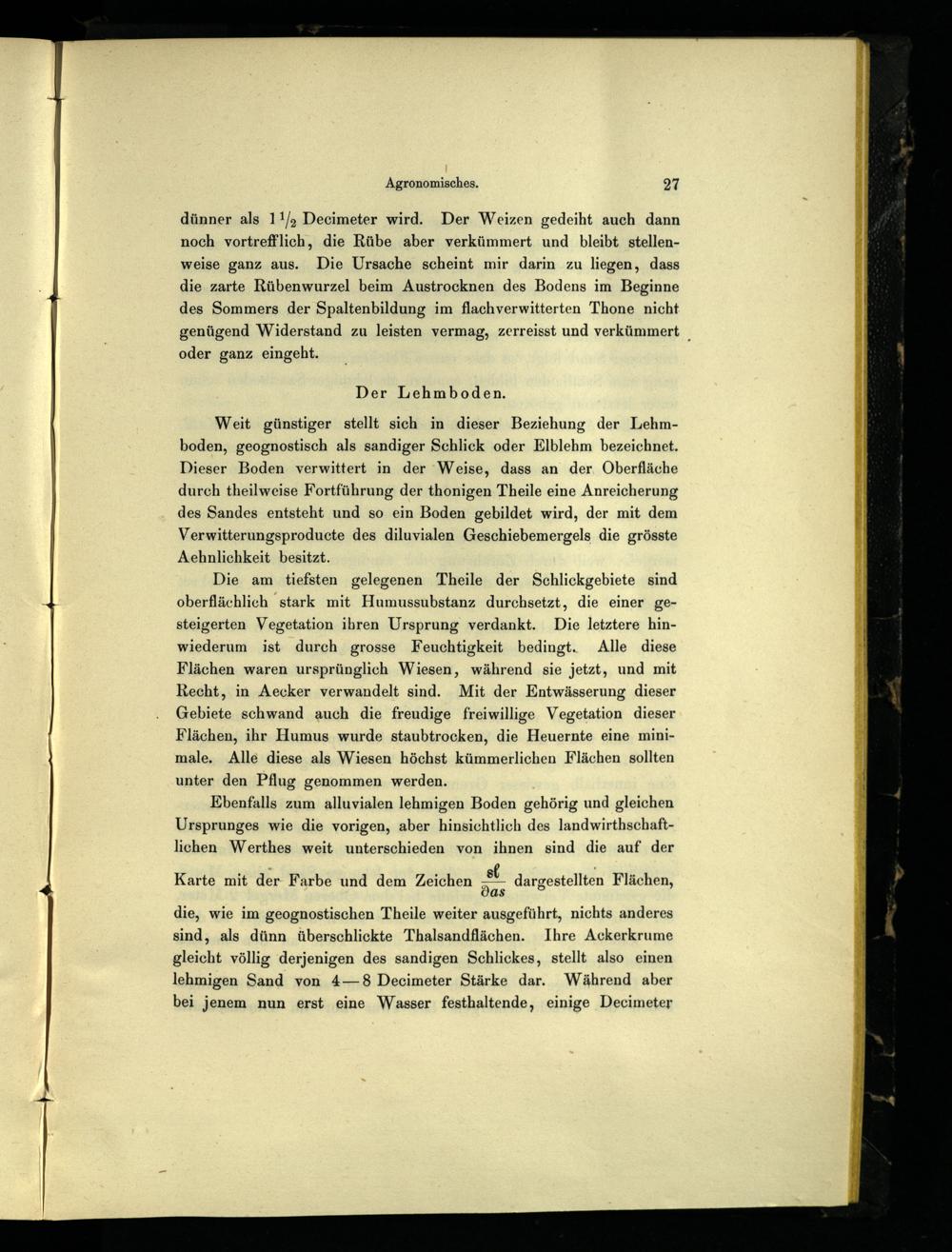 Weit günstiger stellt sich in dieser Beziehung der Lehmboden, geognostisch als sandiger Schlick oder Elblehm bezeichnet. Dieser Boden verwittert in der Weise, dass an der, Oberfläche durch theilweise Fortführung der thonigen Theile eine Anreicherung des Sandes entsteht und so ein Boden gebildet wird, der mit dem Verwitterungsproducte des diluvialen Geschiebemergels die grösste Aehnlichkeit besitzt.