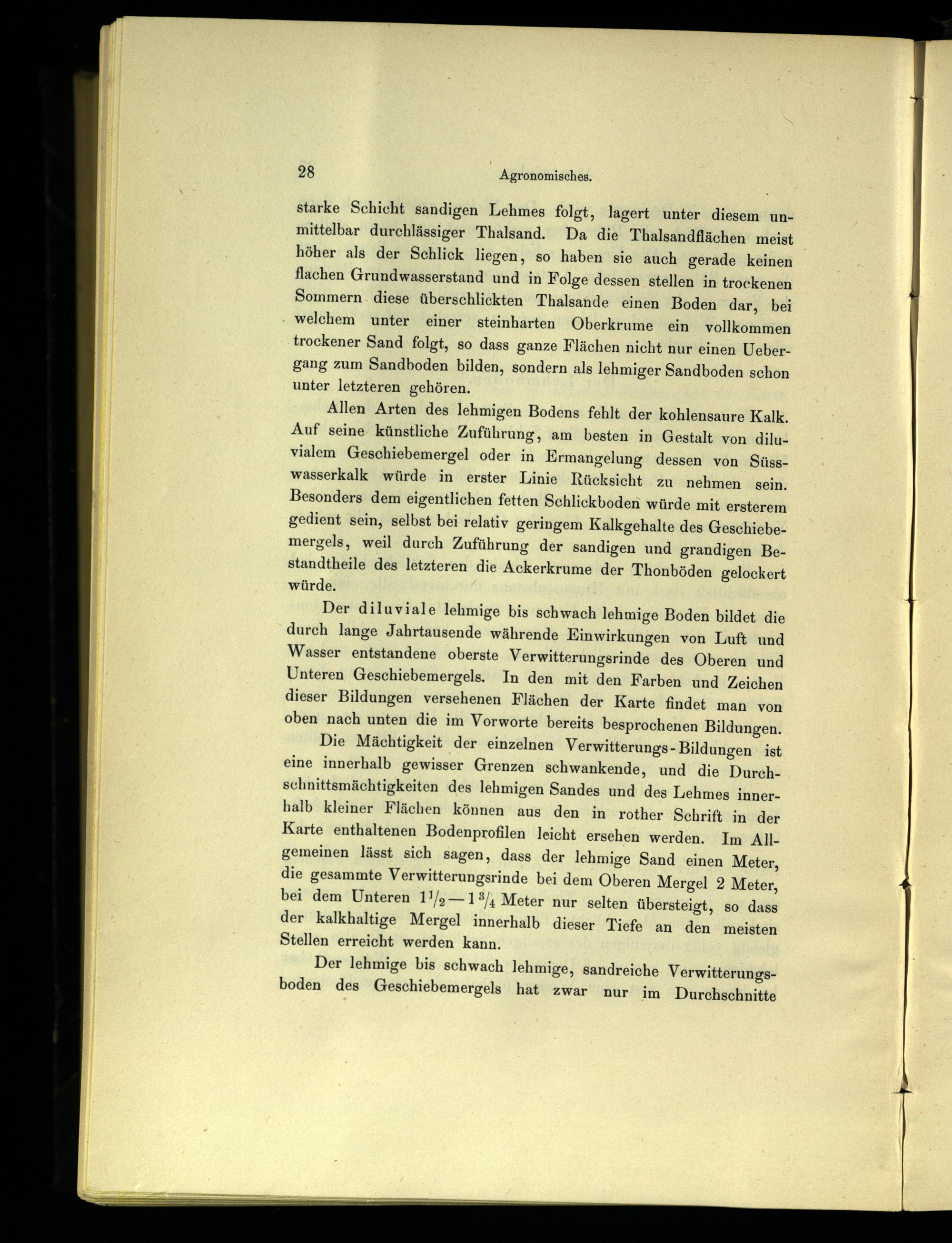 Die Mächtigkeit der einzelnen Verwitterungs- Bildungen ist eine innerhalb gewisser Grenzen schwankende, und die Durchschnittsmächtigkeiten des lehmigen Sandes und des Lehmes innerhalb kleiner Flächen können aus den in rother Schrift in der Karte enthaltenen Bodenprofilen leicht ersehen werden. Im Allgemeinen lässt sich sagen, dass der lehmige Sand einen Meter, die gesammte Verwitterungsrinde bei dem Oberen Mergel 2 Meter, bei dem Unteren 17/2— 18/4 Meter nur selten übersteigt, so dass der kalkhaltige Mergel innerhalb dieser Tiefe an den meisten Stellen erreicht werden kann.