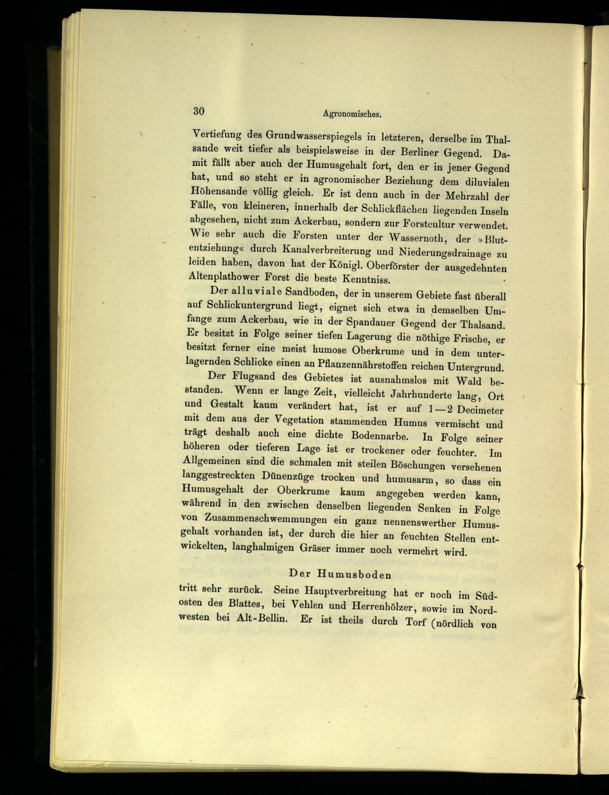 Der allu viale Sandboden, der in unserem Gebiete fast überall auf Schlickuntergrund liegt, eignet sich etwa in demselben Umfange zum Ackerbau, wie in der Spandauer Gegend der Thalsand. Er besitzt in Folge seiner tiefen Lagerung die nöthige Frische, er besitzt ferner eine meist humose Oberkrume und in dem unterlagernden Schlicke einen an Pflanzennährstoffen reichen Untergrund.