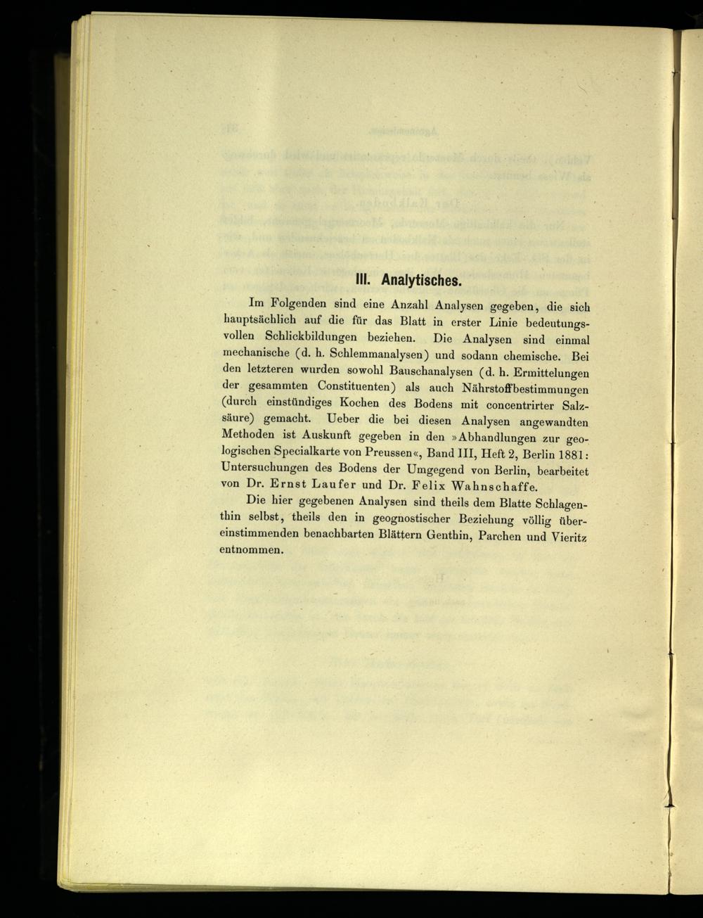 Im Folgenden sind eine Anzahl Analysen gegeben, die sich hauptsächlich auf die für das Blatt in erster Linie bedeutungsvollen Schlickbildungen beziehen. Die Analysen sind einmal mechanische(d. h. Schlemmanalysen) und sodann chemische. Bei den letzteren wurden sowohl Bauschanalysen(d. h. Ermittelungen der gesammten Constituenten) als auch Nährstoffbestimmungen (durch einstündiges Kochen des Bodens mit concentrirter Salzsäure) gemacht. Ueber die bei diesen Analysen angewandten Methoden ist Auskunft gegeben in den»Abhandlungen zur geologischen Specialkarte von Preussen«, Band JII, Heft 2, Berlin 1881: Untersuchungen des Bodens der Umgegend von Berlin, bearbeitet von Dr. Ernst Laufer und Dr. Felix Wahnschaffe.