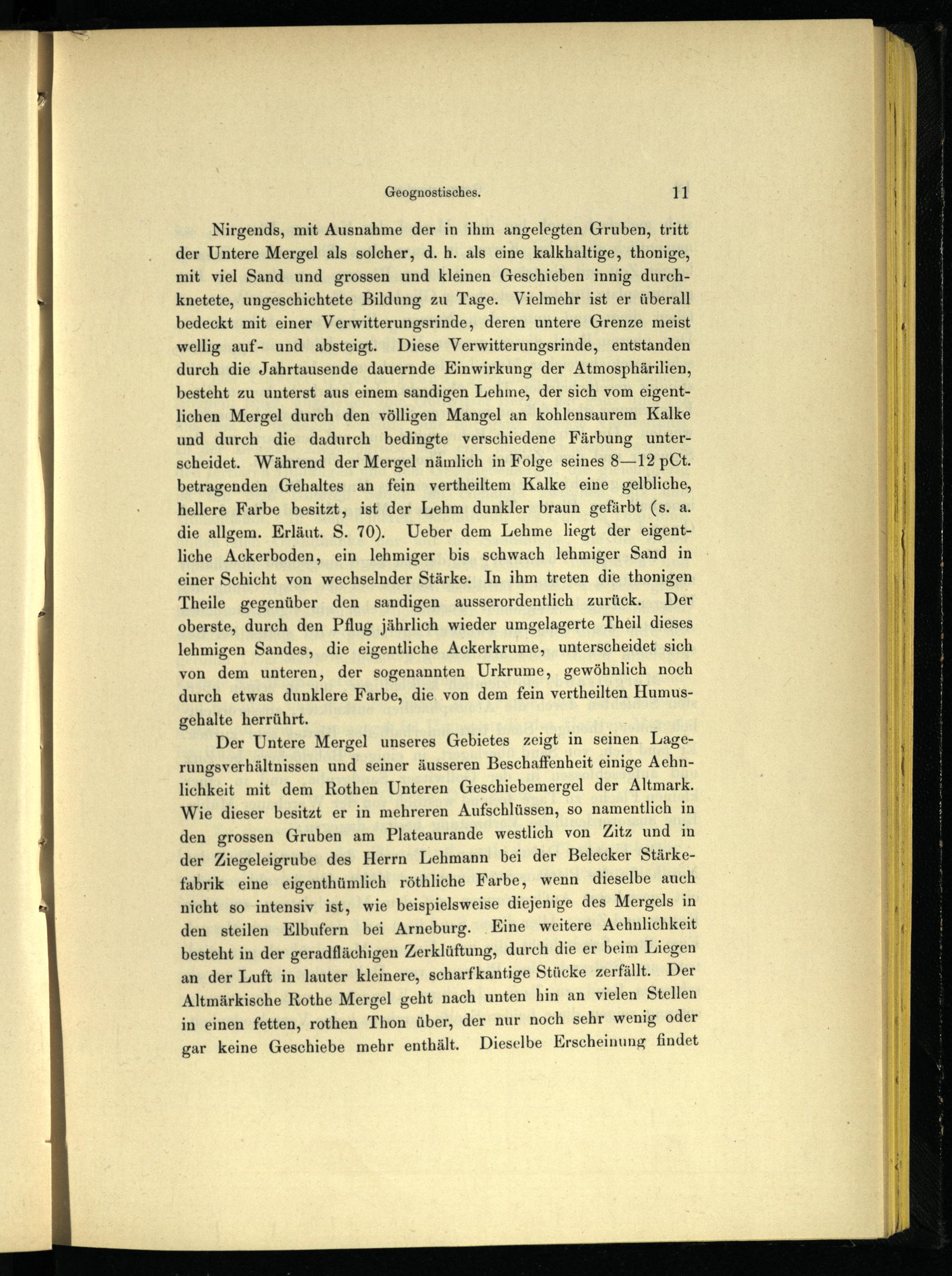 Nirgends, mit Ausnahme der in ihm angelegten Gruben, tritt der Untere Mergel als solcher, d. h. als eine kalkhaltige, thonige, mit viel Sand und grossen und kleinen Geschieben innig durchknetete, ungeschichtete Bildung zu Tage. Vielmehr ist er überall bedeckt mit einer Verwitterungsrinde, deren untere Grenze meist wellig auf- und absteigt. Diese Verwitterungsrinde, entstanden durch die Jahrtausende dauernde Einwirkung der Atmosphärilien, besteht zu unterst aus einem sandigen Lehme, der sich vom eigentlichen Mergel durch den völligen Mangel an kohlensaurem Kalke und durch die dadurch bedingte verschiedene Färbung unterscheidet. Während der Mergel nämlich in Folge seines 8—12 pCt. betragenden Gehaltes an fein vertheiltem Kalke eine gelbliche, hellere Farbe besitzt, ist der Lehm dunkler braun gefärbt(s. a. die allgem. Erläut. S. 70). Ueber dem Lehme liegt der eigentliche Ackerboden, ein lehmiger bis schwach lehmiger Sand in einer Schicht von wechselnder Stärke. In ihm treten die thonigen Theile gegenüber den sandigen ausserordentlich zurück. Der oberste, durch den Pflug jährlich wieder umgelagerte Theil dieses lehmigen Sandes, die eigentliche Ackerkrume, unterscheidet sich von dem unteren, der sogenannten Urkrume, gewöhnlich noch durch etwas dunklere Farbe, die, von dem fein vertheilten Humusgehalte herrührt.