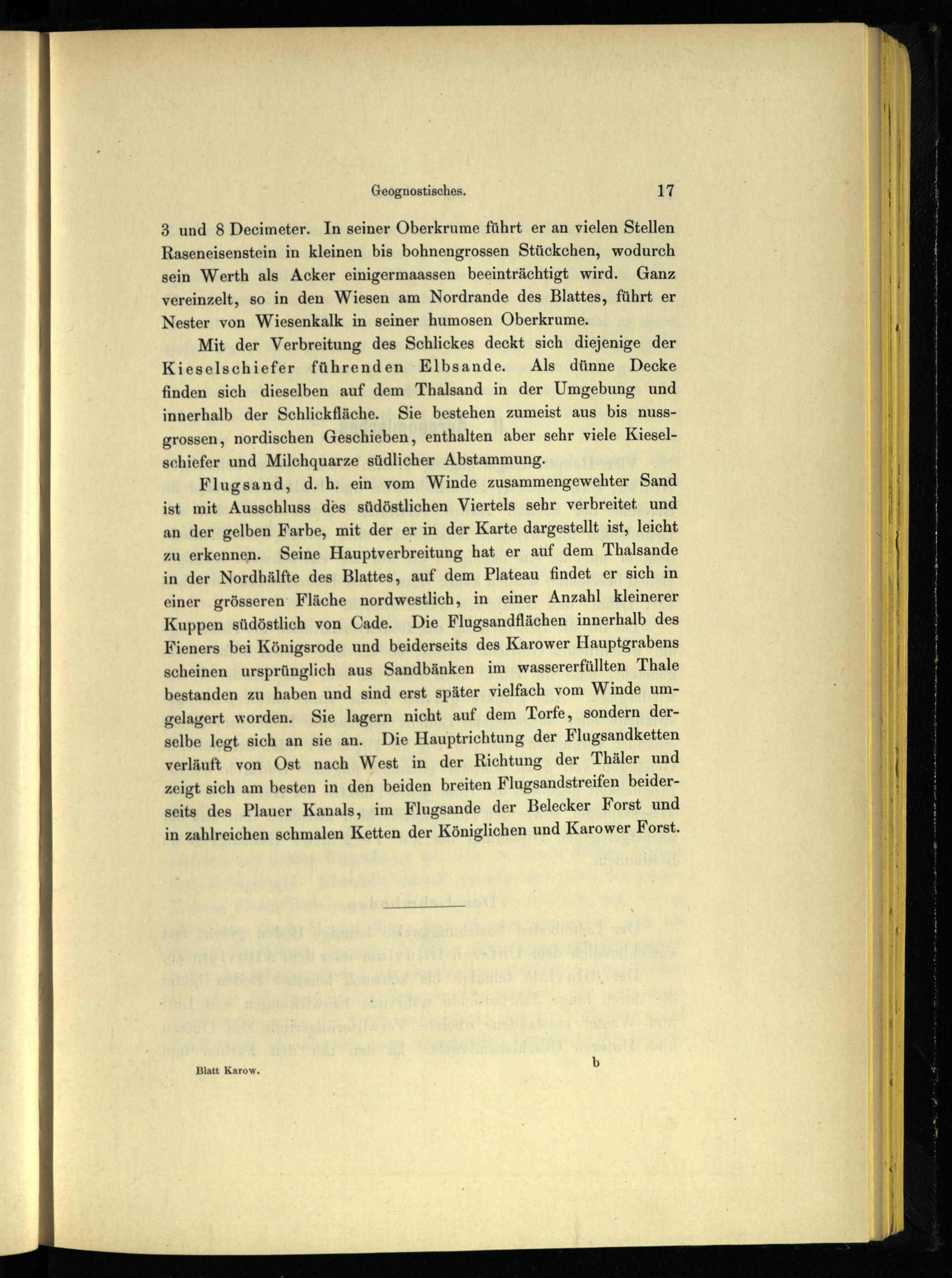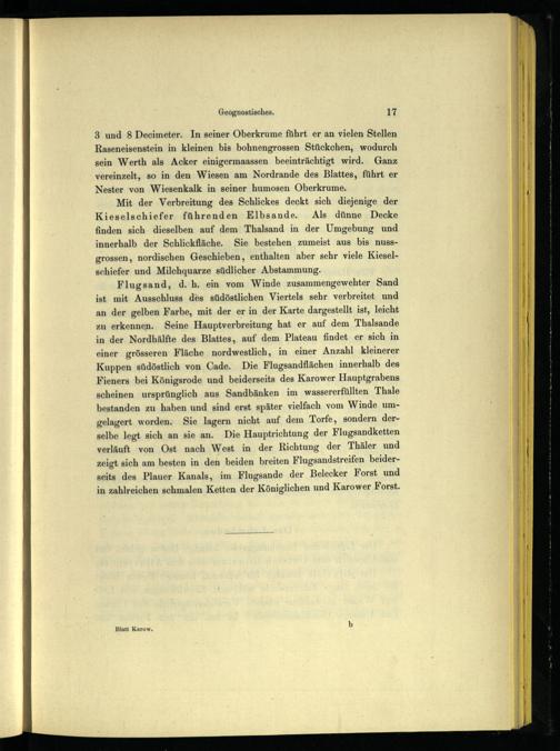 Flugsand, d. h. ein vom Winde zusammengewehter Sand ist mit Ausschluss des südöstlichen Viertels sehr verbreitet und an der gelben Farbe, mit der er in der Karte dargestellt ist, leicht zu erkennen. Seine Hauptverbreitung hat er auf dem Thalsande in der Nordhälfte des Blattes, auf dem Plateau findet er sich in einer grösseren‘ Fläche nordwestlich, in einer Anzahl kleinerer Kuppen südöstlich von Cade. Die Flugsandflächen innerhalb des Fieners bei Königsrode und beiderseits des Karower Hauptgrabens scheinen ursprünglich aus Sandbänken im wassererfüllten Thale bestanden zu haben und sind erst später vielfach vom Winde umgelagert worden. Sie lagern nicht auf dem Torfe, sondern derselbe legt sich an sie an. Die Hauptrichtung der Flugsandketten verläuft von Ost nach West in der Richtung der Thäler und zeigt sich am besten in den beiden breiten Flugsandstreifen beiderseits des Plauer Kanals, im Flugsande der Belecker Forst und in zahlreichen schmalen Ketten der Königlichen und Karower Forst.