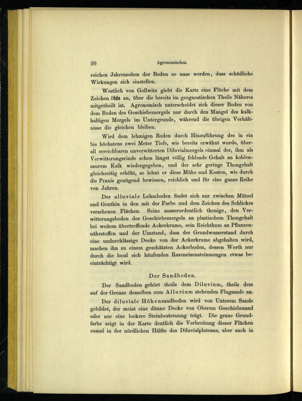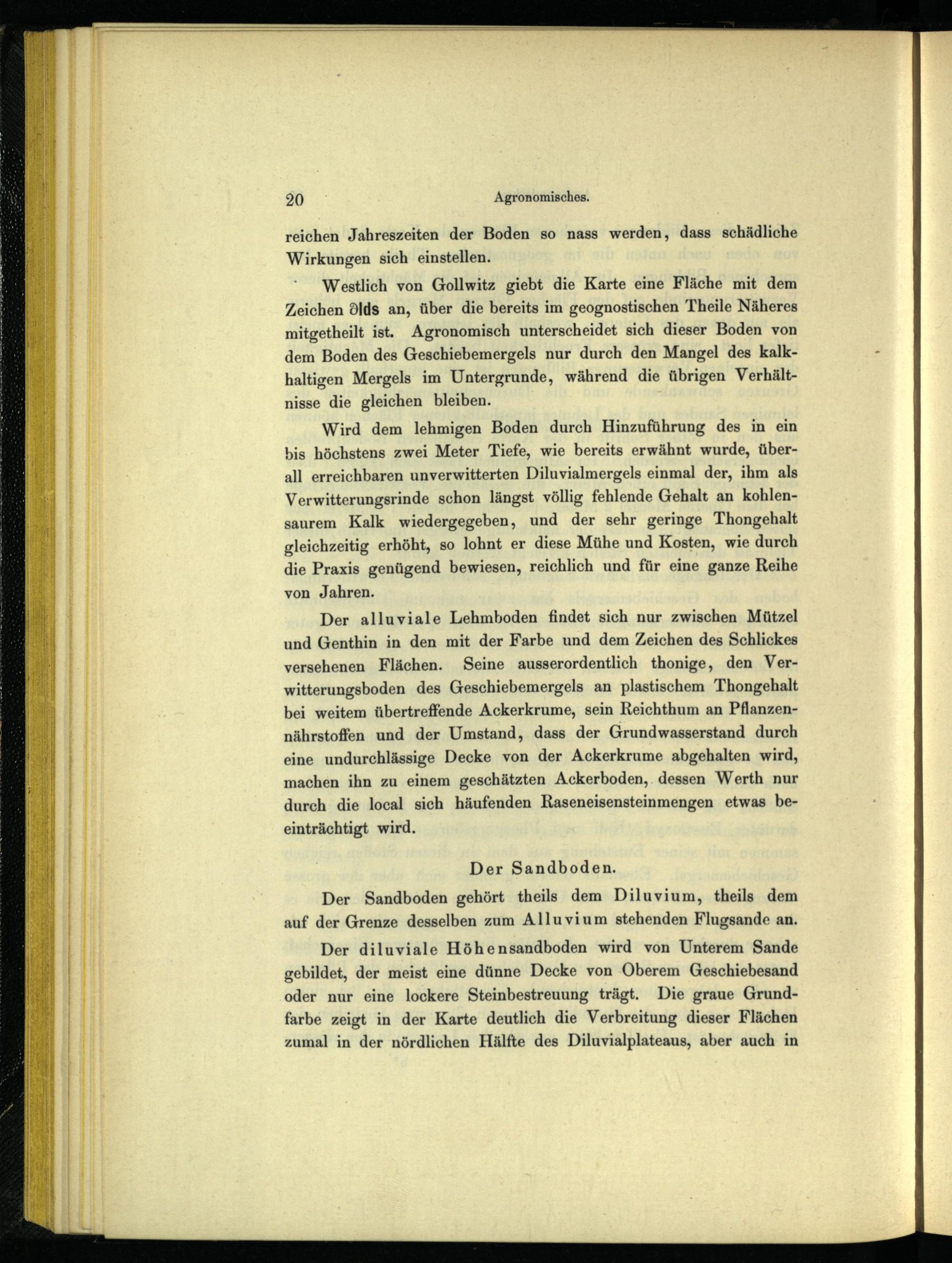 Westlich von Gollwitz giebt die Karte eine Fläche mit dem Zeichen dlds an, über die bereits im geognostischen Theile Näheres mitgetheilt ist. Agronomisch unterscheidet sich dieser Boden von dem Boden des Geschiebemergels nur durch den Mangel des kalkhaltigen Mergels im Untergrunde, während die übrigen Verhältnisse die gleichen bleiben.