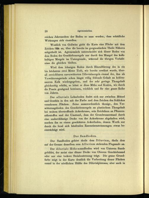 Der alluviale Lehmboden findet sich nur zwischen Mützel und Genthin in den mit der Farbe und dem Zeichen des Schlickes versehenen Flächen. Seine ausserordentlich thonige, den Verwitterungsboden des Geschiebemergels an plastischem Thongehalt bei weitem übertreffende Ackerkrume, sein Reichthum an Pflanzennährstoffen und der Umstand, dass der Grundwasserstand durch eine undurchlässige Decke von der Ackerkrume abgehalten wird, machen ihn zu einem geschätzten Ackerboden,. dessen Werth nur durch die local sich häufenden Raseneisensteinmengen etwas be