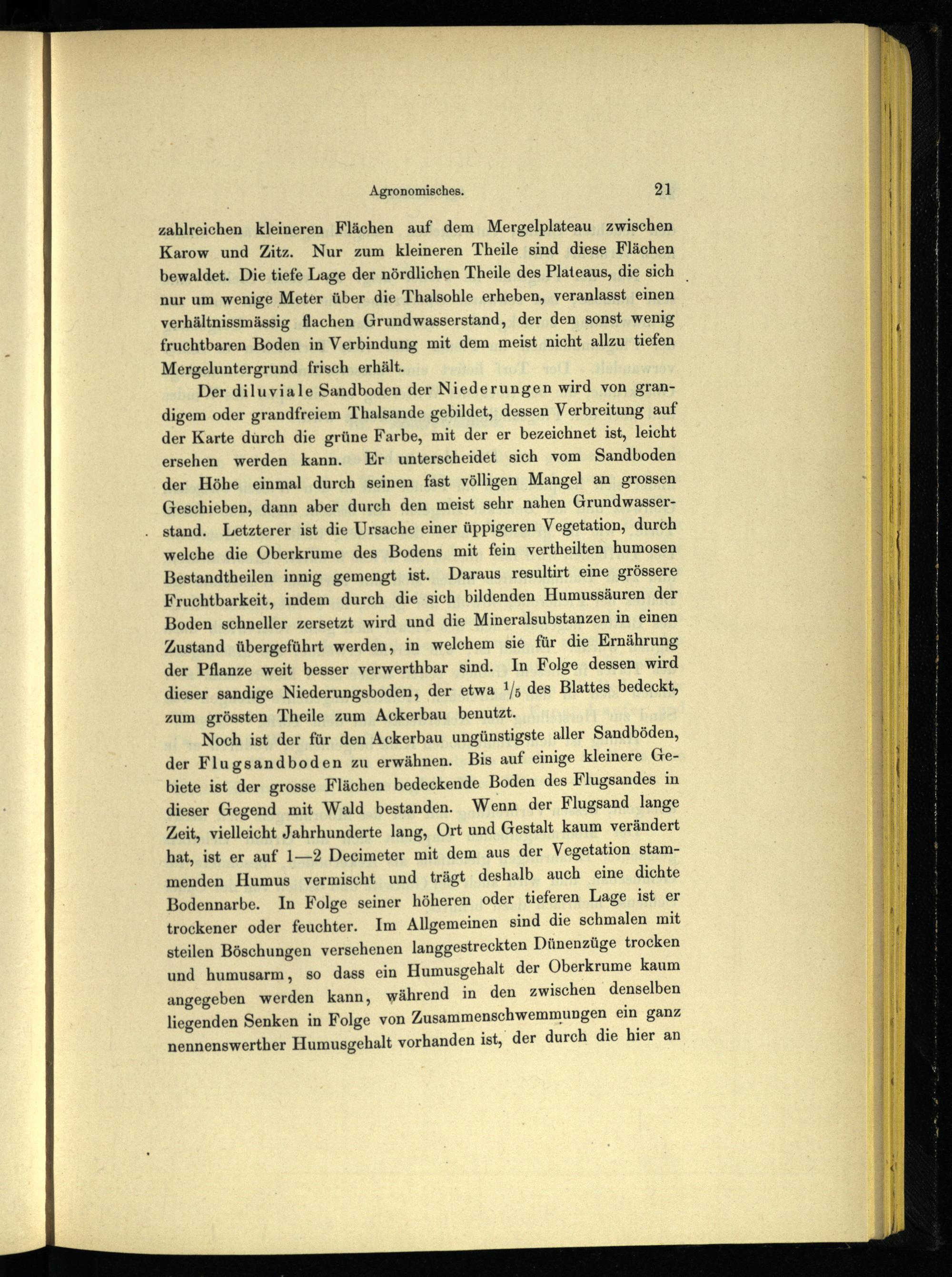 zahlreichen kleineren Flächen auf dem Mergelplateau zwischen Karow und Zitz. Nur zum kleineren Theile sind diese Flächen bewaldet. Die tiefe Lage der nördlichen Theile des Plateaus, die sich nur um wenige Meter über die Thalsohle erheben, veranlasst einen verhältnissmässig flachen Grundwasserstand, der den sonst wenig fruchtbaren Boden in Verbindung mit dem meist nicht allzu tiefen Mergeluntergrund frisch erhält.