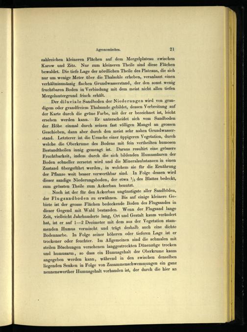 Der diluviale Sandboden der Niederungen wird von grandigem oder grandfreiem Thalsande gebildet, dessen Verbreitung auf der Karte durch die grüne Farbe, mit der er bezeichnet ist, leicht ersehen werden kann. Er unterscheidet sich vom Sandboden der Höhe einmal durch seinen fast völligen Mangel an grossen Geschieben, dann aber durch den meist sehr nahen Grundwasserstand. Letzterer ist die Ursache einer üppigeren Vegetation, durch welche die Oberkrume des Bodens mit fein vertheilten humosen Bestandtheilen innig gemengt ist. Daraus resultirt eine grössere Fruchtbarkeit, indem durch die ‚sich bildenden Humussäuren der Boden schneller zersetzt wird und die Mineralsubstanzen in einen Zustand übergeführt werden, in welchem sie für die Ernährung der Pflanze weit besser verwerthbar sind. In Folge dessen wird dieser sandige Niederungsboden, der etwa*!/5 des Blattes bedeckt, zum grössten Theile zum Ackerbau benutzt.