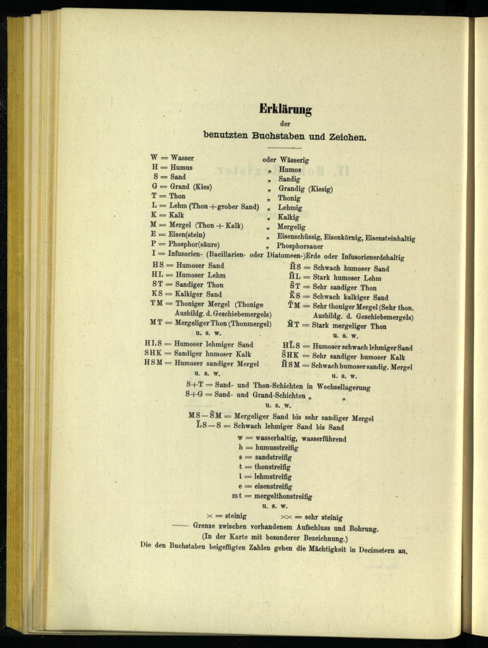 W= Wasser oder Wässerig H= Humus Humos S= Sand Sandig G= Grand(Kies) Grandig(Kiesig) = Thon Thonig L= Lehm(Thon+grober Sand) Lehmig K= Kalk Kalkig M= Mergel(Thon+ Kalk) Mergelig E= Eisen(stein) Eisenschüssig, Eisenkörnig, Eisensteinhaltig P= Phosphor(säure)» Phosphorsauer I= Infusorien-(Baeillarien- oder Diatomeen-)Erde oder Infusorienerdehaltig HS= Humoser Sand HS= Schwach humoser Sand HL= Humoser Lehm HL= Stark humoser Lehm ST= Sandiger Thon ST= Sehr sandiger Thon KS= Kalkiger Sand K8= Schwach kalkiger Sand TM= Thoniger Mergel(Thonige TM= Sehr thoniger Mergel(Sehr thon, Ausbildg. d. Geschiebemergels) Ausbildg. d. Geschiebemergels) MT= Mergeliger Thon(Thonmergel) MT= Stark mergeliger Thon u. 8, VW.; u 8 VW. HLS= Humoser lehmiger Sand* HLS= Humoser schwach lehmiger Sand SHK= Sandiger humoser Kalk SHK= Sehr sandiger humoser Kalk HSM= Humoser sandiger Mergel HSM= Schwach humosersandig. Mergel u. 8. W. u. 8. W. S+T= Sand- und Thon-Schichten in Wechsellagerung S-+G= Sand- und Grand-Schichten” U. 8..W.