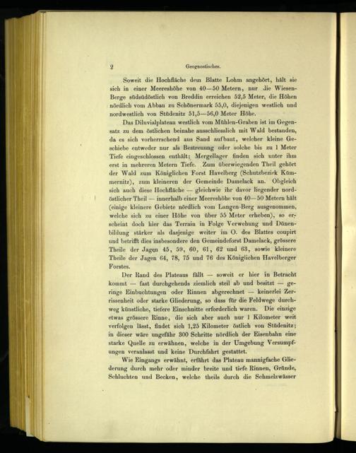 Das Diluvialplateau westlich vom Mühlen-Graben ist im Gegensatz zu dem östlichen beinahe ausschliesslich mit Wald bestanden, da es sich vorherrschend aus Sand aufbaut, welcher kleine Geschiebe entweder nur als Bestreuung oder solche bis zu 1 Meter Tiefe eingeschlossen enthält; Mergellager finden sich unter ihm erst in mehreren Metern Tiefe. ‚Zum überwiegenden Theil gehört der Wald zum Königlichen Forst Havelberg(Schutzbezirk Kümmernitz), zum kleineren der Gemeinde Damelack an. Obgleich sich auch diese Hochfläche-— gleichwie ihr davor liegender nordöstlicher Theil— innerhalb einer Meereshöhe von 40—50 Metern hält (einige kleinere Gebiete nördlich vom Langen-Berg ausgenommen, welche sich zu einer Höhe von über 55 Meter erheben), so erscheint doch hier das Terrain in Folge Verwehung und Dünenbildung stärker als dasjenige weiter im O. des Blattes coupirt und betrifft dies insbesondere den Gemeindeforst Damelack, grössere Theile der Jagen 45, 59, 60, 61, 62 und 63, sowie kleinere Theile der Jagen 64, 78, 75 und 76 des Königlichen Havelberger Forstes.