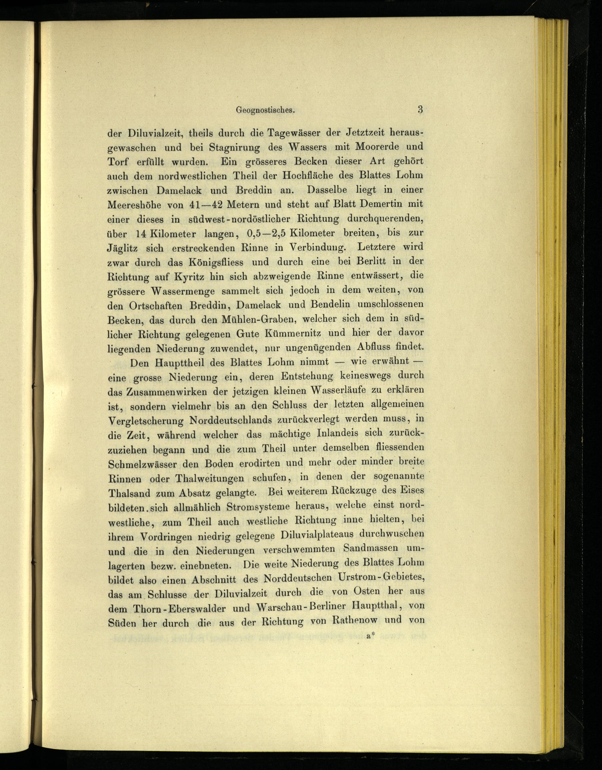 der Diluvialzeit, theils durch die Tagewässer der Jetztzeit herausgewaschen und bei Stagnirung des Wassers mit Moorerde und Torf erfüllt wurden. KEin grösseres Becken dieser Art gehört auch dem nordwestlichen Theil der Hochfläche des Blattes Lohm zwischen Damelack und Breddin an. Dasselbe liegt in einer Meereshöhe von 41—42 Metern und steht auf Blatt Demertin mit einer dieses in südwest-nordöstlicher Richtung durchquerenden, über 14 Kilometer langen, 0,5—2,5 Kilometer breiten, bis zur Jäglitz sich erstreckenden Rinne in Verbindung. Letztere wird zwar durch das Königsfliess und durch eine bei Berlitt in der Richtung auf Kyritz hin sich abzweigende Rinne entwässert, die grössere Wassermenge sammelt sich jedoch in dem weiten, von den Ortschaften Breddin, Damelack und Bendelin umschlossenen Becken, das durch den Mühlen-Graben, welcher sich dem in südlicher Richtung gelegenen Gute Kümmernitz und hier der davor liegenden Niederung zuwendet, nur ungenügenden Abfluss findet.