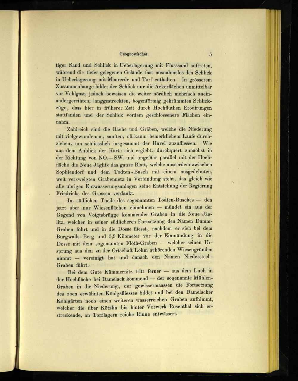 Zahlreich sind die Bäche und Gräben, welche die Niederung mit vielgewundenem, sanften, oft kaum bemerklichem Laufe durchziehen, um schliesslich insgesammt der Havel zuzufliessen. Wie aus dem Anblick der Karte sich ergiebt, durchquert zunächst in der Richtung von NO.—SW. und ungefähr parallel mit der Hochfläche die Neue Jäglitz das ganze Blatt, welche ausserdem zwischen Sophiendorf und dem Todten-Busch mit einem ausgedehnten, weit‘ verzweigten Grabennetz in Verbindung steht, das gleich wie alle übrigen Entwässerungsanlagen seine Entstehung der Regierung Friedrichs des Grossen verdankt.