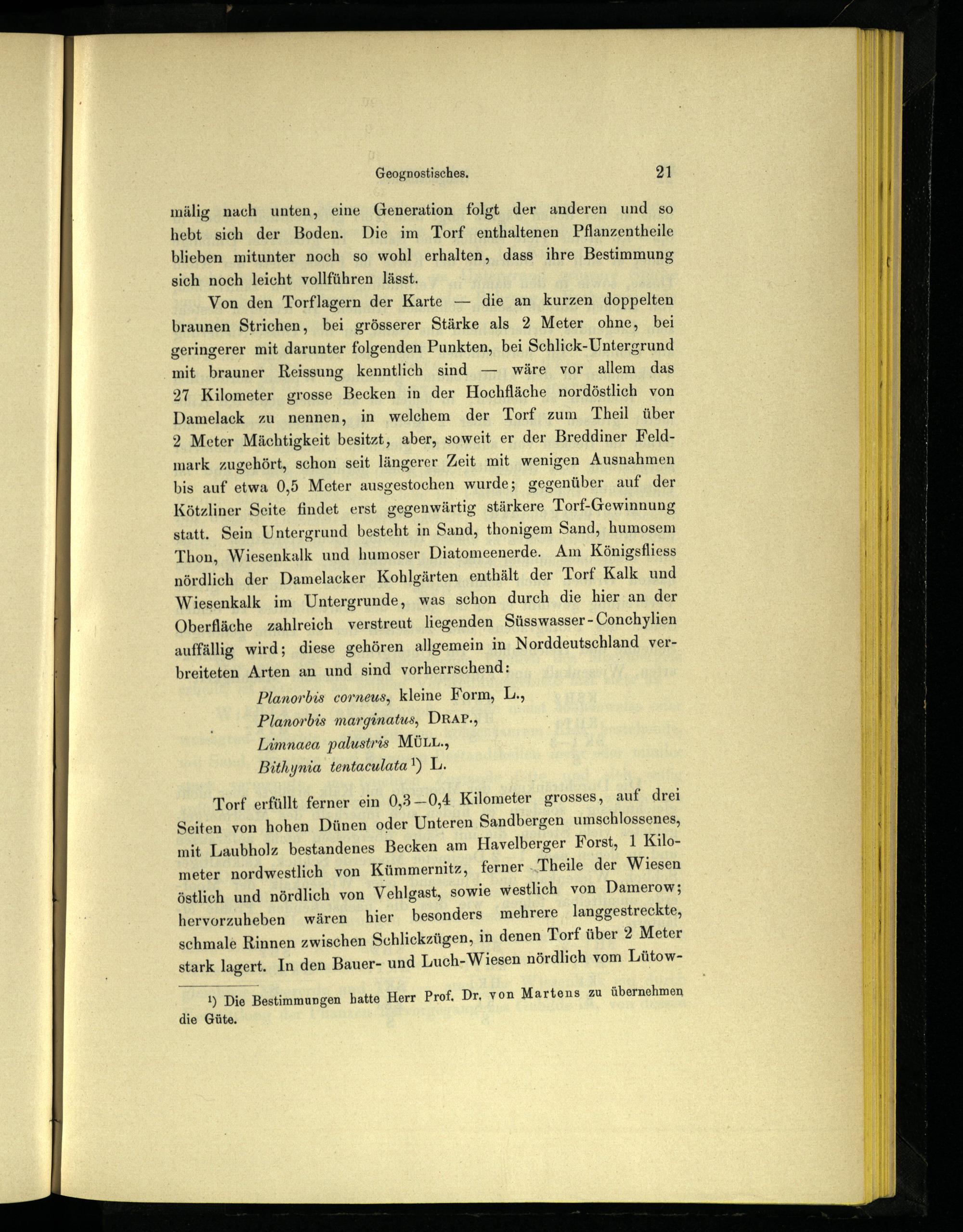 Von den Torflagern der Karte— die an kurzen doppelten braunen Strichen, bei grösserer Stärke als 2 Meter ohne, bei geringerer mit darunter folgenden Punkten, bei Schlick-Untergrund mit brauner Reissung kenntlich sind— wäre vor allem das 27 Kilometer grosse Becken in der Hochfläche nordöstlich von Damelack zu nennen, in welchem der Torf zum Theil über 2 Meter Mächtigkeit besitzt, aber, soweit er der Breddiner Feldmark zugehört, schon seit längerer Zeit mit wenigen Ausnahmen bis auf etwa 0,5 Meter ausgestochen wurde; gegenüber auf der Kötzliner Seite findet erst gegenwärtig stärkere Torf-Gewinnung statt. Sein Untergrund besteht in Sand, thonigem Sand, humosem Thon, Wiesenkalk und humoser Diatomeenerde. Am Königsfliess nördlich der Damelacker Kohlgärten enthält der Torf Kalk und Wiesenkalk im Untergrunde, was schon durch die hier an der Oberfläche zahlreich verstreut liegenden Süsswasser- Conchylien auffällig wird; diese gehören allgemein in Norddeutschland verbreiteten Arten an und sind vorherrschend: