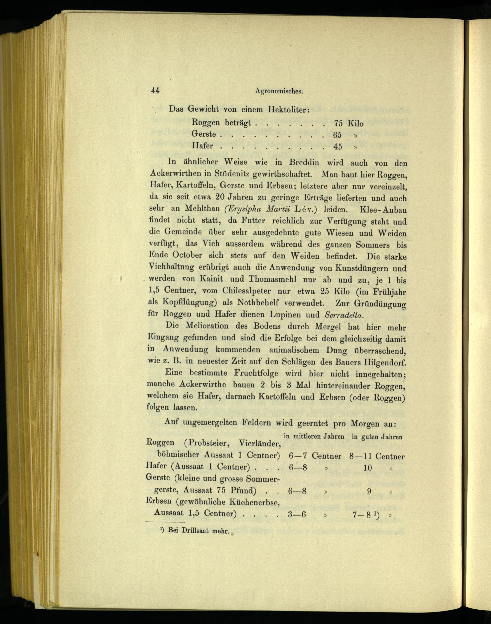 In ähnlicher Weise wie in Breddin wird auch von den Ackerwirthen in Stüdenitz gewirthschaftet. Man baut hier Roggen, Hafer, Kartoffeln, Gerste und Erbsen; letztere aber nur vereinzelt, da sie seit etwa 20 Jahren zu geringe Erträge lieferten und auch sehr an Mehlthau(Zrysipha Marti Lev.) leiden. Klee- Anbau findet nicht statt, da Futter reichlich zur Verfügung steht und die Gemeinde über sehr ausgedehnte gute Wiesen und Weiden verfügt, das Vieh ausserdem während des ganzen Sommers bis Ende October sich stets auf den Weiden befindet. Die starke Viehhaltung erübrigt auch die Anwendung von Kunstdüngern und . werden von Kainit und Thomasmehl nur ab und zu, je 1 bis 1,5 Centner, vom Chilesalpeter nur etwa 25 Kilo(im Frühjahr als Kopfdüngung) als Nothbehelf verwendet. Zur Gründüngung für Roggen und Hafer dienen Lupinen und Serradella.