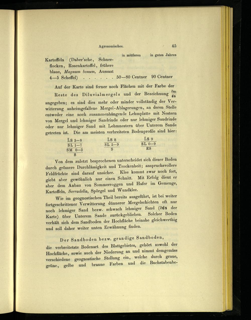 Wie im geognostischen Theil bereits ausgeführt, ist bei weiter fortgeschrittener Verwitterung dünnerer Mergelschichten oft nur noch lehmiger Sand bezw. schwach lehmiger Sand(dds der Karte) über Unterem Sande zurückgeblieben. Solcher Boden verhält sich dem Sandboden der Hochfläche beinahe gleichwerthig und soll daher weiter unten Erwähnung finden.