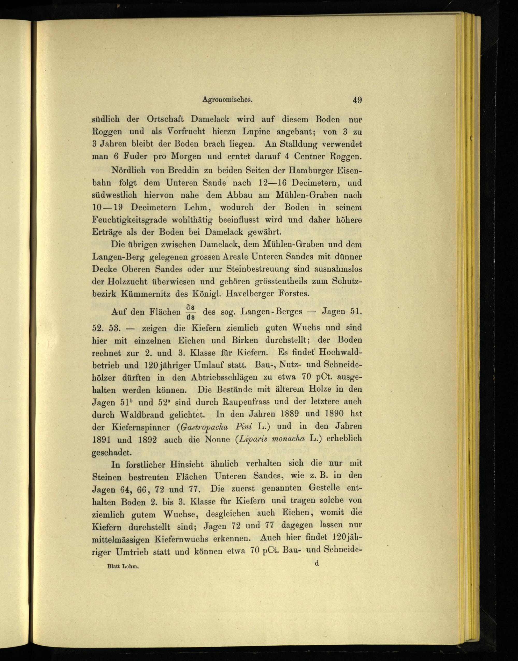 südlich der Ortschaft Damelack wird ‚auf diesem Boden nur Roggen und als Vorfrucht hierzu Lupine angebaut; von 3 zu 3 Jahren bleibt der Boden brach liegen. An Stalldung verwendet man 6 Fuder pro Morgen und erntet darauf 4 Centner Roggen.