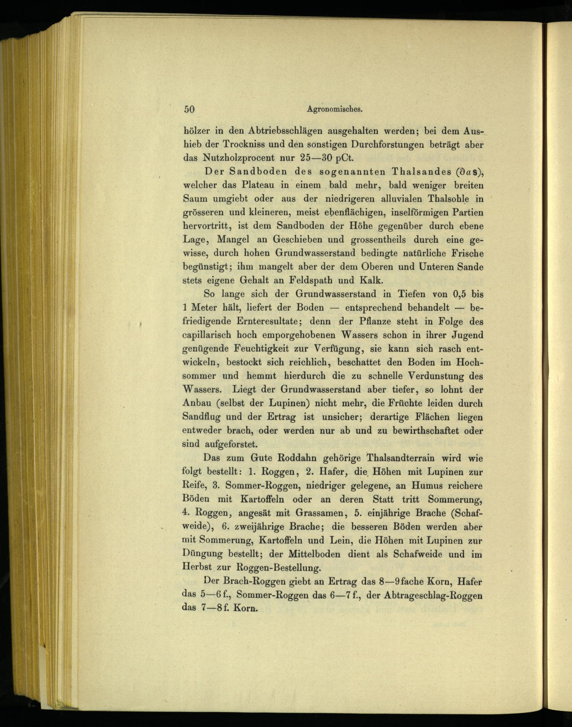 Das zum Gute Roddahn gehörige Thalsandterrain wird wie folgt bestellt: 1. Roggen, 2. Hafer, die Höhen mit Lupinen zur Reife, 3. Sommer-Roggen, niedriger gelegene, an Humus reichere Böden mit Kartoffeln oder an deren Statt tritt Sommerung, 4. Roggen, angesät mit Grassamen, 5. einjährige Brache(Schafweide), 6. zweijährige Brache; die besseren Böden werden aber mit Sommerung, Kartoffeln und Lein, die Höhen mit Lupinen zur Düngung bestellt; der Mittelboden dient als Schafweide und im Herbst zur Roggen-Bestellung.