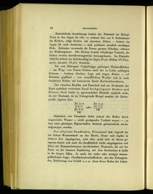 Beträchtliche Ausdehnung besitzt der Thalsand im Königl. Forst in den Jagen 24—28; er rechnet hier zur 3. Bodenklasse für Kiefern, trägt Kiefern mit einzelnen Birken— letztere im Jagen 24 auch forstweise— und producirt ziemlich wuchtiges Holz. Zeitweise verursacht die Nonne grossen Schaden, seltener der Kiefernspinner. Für Kiefern besteht 120 jähriger Umtrieb, die Birken werden durchforstungsweise herausgehauen. Im Etatsjahr 1893/94 lieferte ein Arbeitsschlag im Jagen 28 pro Hektar 378 Festmeter, darunter 78 pCt. Nutzholz.