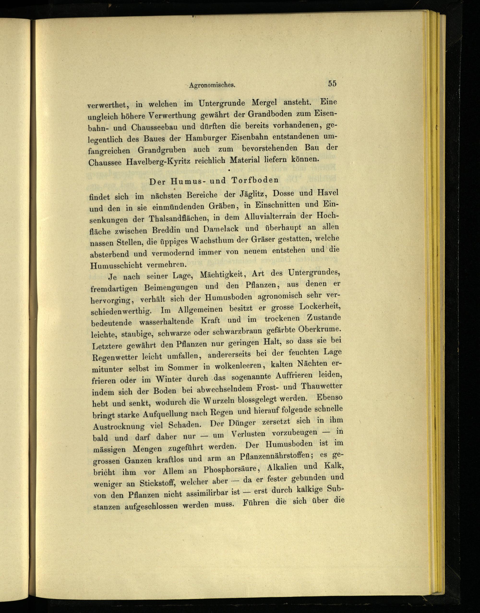 Je nach seiner Lage, Mäehtigkeit, Art des Untergrundes, fremdartigen Beimengungen und den Pflanzen, aus denen er hervorging, verhält sich der Humusboden agronomisch sehr verschiedenwerthig. Im Allgemeinen besitzt er grosse Lockerheit, bedeutende wasserhaltende Kraft und im trockenen Zustande leichte, staubige, schwarze oder schwarzbraun gefärbte Oberkrume. Letztere gewährt den Pflanzen nur geringen Halt, so dass sie bei Regenwetter leicht umfallen, andererseits bei der feuchten Lage mitunter selbst im Sommer in wolkenleeren, kalten Nächten erfrieren oder im Winter durch.das sogenannte Auffrieren leiden, indem sich der Boden bei abwechselndem Frost- und Thauwetter hebt und senkt, wodurch die Wurzeln blossgelegt werden. Ebenso bringt starke Aufquellung nach Regen und hierauf folgende schnelle Austrocknung viel Schaden. Der Dünger zersetzt sich in ihm bald und: darf. daher nur— um Verlusten vorzubeugen— in mässigen Mengen zugeführt werden. Der Humusboden ist im grossen Ganzen Kraftlos und arm an Pflanzennährstoffen; es gebricht ihm vor Allem an Phosphorsäure, Alkalien und Kalk, weniger an Stickstoff, welcher aber— da er’ fester gebunden und von den Pflanzen nicht assimilirbar ist— erst durch kälkige Substanzen aufgeschlossen werden muss. Führen die sich über die