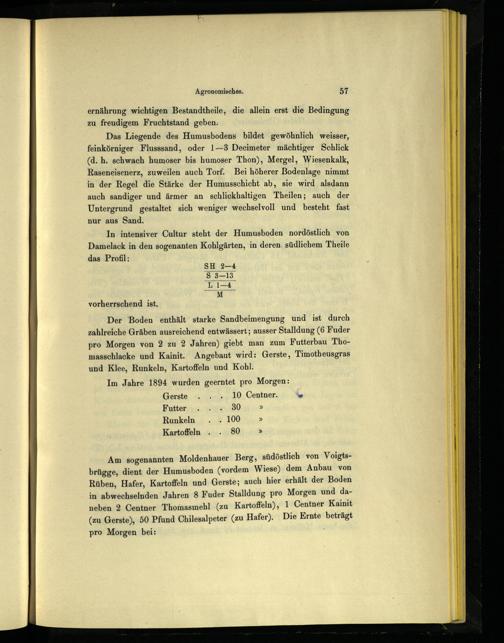 Am sogenannten Moldenhauer Berg, südöstlich von Voigtsbrügge, dient der Humusboden(vordem Wiese) dem Anbau von Rüben, Hafer, Kartoffeln und. Gerste; auch hier erhält der Boden in abwechselnden Jahren 8 Fuder Stalldung pro Morgen und daneben 2 Centner Thomasmehl ‚(zu Kartoffeln), 1 Centner Kainit (zu Gerste), 50 Pfund Chilesalpeter(zu Hafer). Die Ernte beträgt pro Morgen bei: