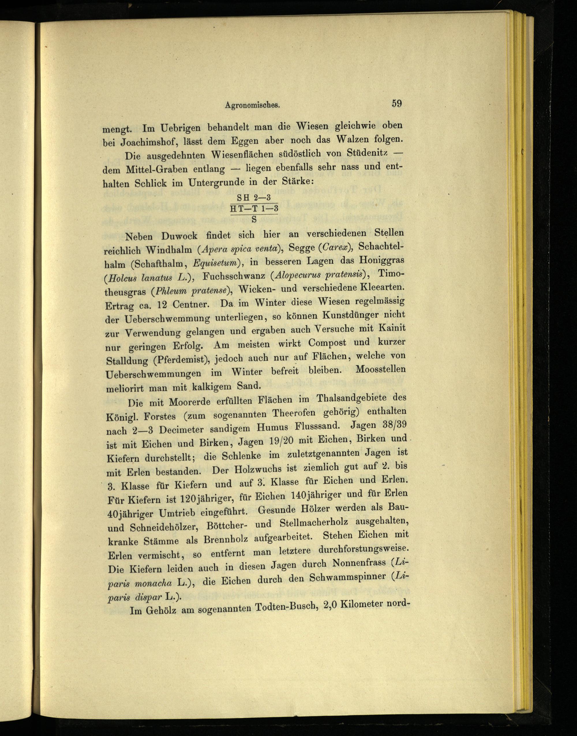 mengt. Im Uebrigen behandelt man die Wiesen gleichwie oben bei Joachimshof, lässt dem Eggen aber noch das Walzen folgen. Die ausgedehnten Wiesenflächen südöstlich von Stüdenitz— dem Mittel-Graben entlang— liegen ebenfalls sehr nass und enthalten Schlick im Untergrunde in der Stärke: SH 2—3 E17 13 Ss Neben Duwock findet sich hier an verschiedenen Stellen reichlich Windhalm(Apera spica venta), Segge(Carex), Schachtelhalm(Schafthalm, Kquisetum), in besseren Lagen das Honiggras (Holcus lanatus L.), Fuchsschwanz(Alopecurus pratensis), Timotheusgras(Phleum pratense), Wicken- und verschiedene Kleearten. Ertrag ca. 12 Centner. Da. im Winter diese Wiesen regelmässig der Ueberschwemmung unterliegen, so können Kunstdünger nicht zur Verwendung gelangen und ergaben auch Versuche mit Kainit nur geringen Erfolg. Am meisten wirkt Compost und kurzer Stalldung(Pferdemist), jedoch auch nur auf Flächen, welche von Ueberschwemmungen im Winter befreit bleiben. Moosstellen meliorirt man mit kalkigem Sand. Die mit Moorerde erfüllten Flächen im Thalsandgebiete des Königl. Forstes(zum sogenannten Theerofen gehörig) enthalten nach 2—3 Deeimeter sandigem Humus Flusssand. Jagen 38/39 ist mit Eichen und Birken, Jagen 19/20 mit Eichen, Birken und Kiefern durchstellt; die Schlenke im zuletztgenannten Jagen ist mit. Erlen bestanden. Der Holzwuchs ist ziemlich gut auf 2. bis ' 8. Klasse für Kiefern und auf 3. Klasse für Eichen und Erlen. Für Kiefern ist 120jähriger, für Eichen 140jähriger und für Erlen 40jähriger Umtrieb eingeführt. Gesunde Hölzer werden als Bauund Schneidehölzer, Böttcher- und Stellmacherholz ausgehalten, kranke Stämme als Brennholz aufgearbeitet. Stehen Eichen mit Erlen vermischt, so entfernt man letztere durchforstungsweise. Die Kiefern leiden auch in diesen Jagen durch Nonnenfrass(Liparis monacha L.), die Eichen durch den Schwammspinner(Liparis dispar L.).| Im Gehölz am sogenannten Todten-Busch, 2,0 Kilometer nord