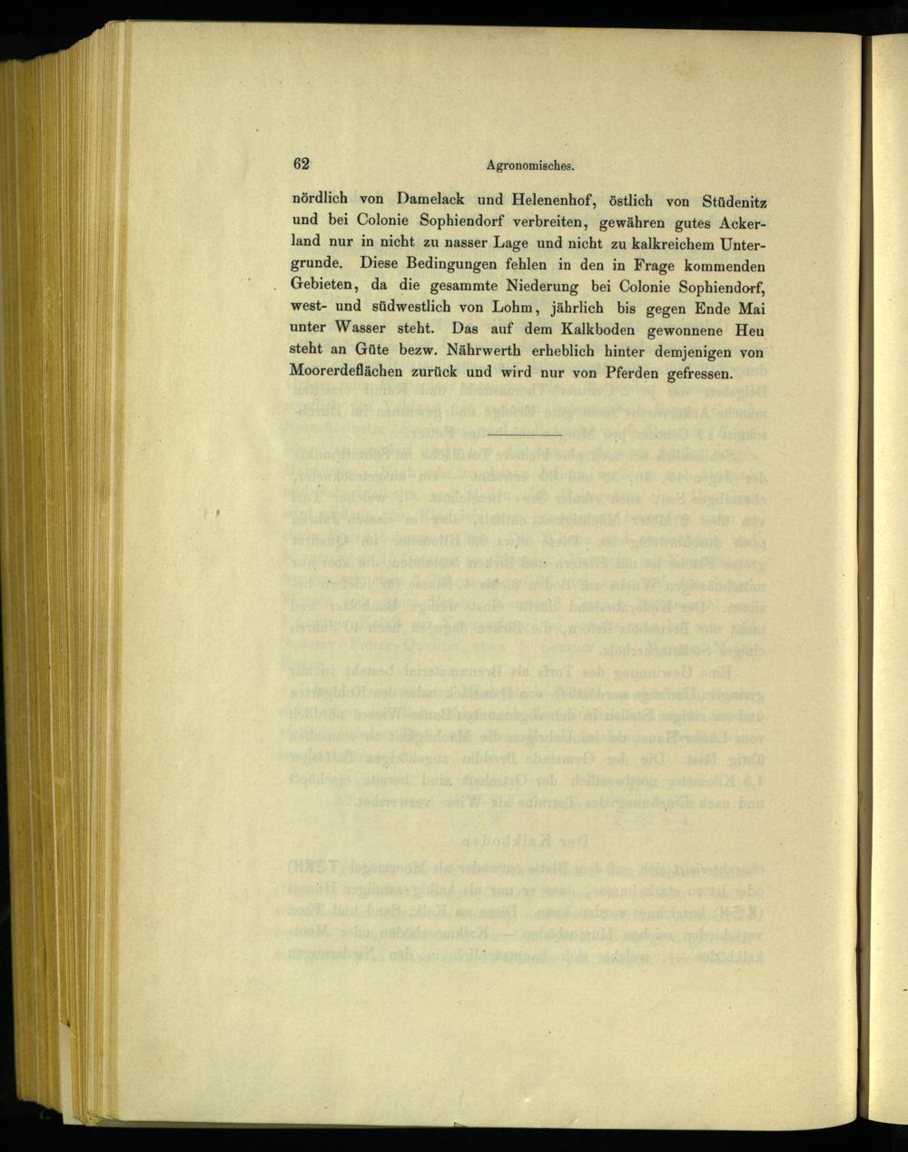 nördlich von Damelack und Helenenhof, östlich von Stüdenitz und bei Colonie Sophiendorf verbreiten, gewähren gutes Ackerland nur in nicht zu nasser Lage und nicht zu kalkreichem Untergrunde, Diese Bedingungen fehlen in den in Frage kommenden Gebieten, da die gesammte Niederung bei Colonie Sophiendorf, west- und südwestlich von Lohm, jährlich bis gegen Ende Mai unter Wasser steht. Das auf dem Kalkboden gewonnene Heu steht an Güte bezw. Nährwerth erheblich hinter demjenigen von Moorerdeflächen zurück und wird nur von Pferden gefressen.