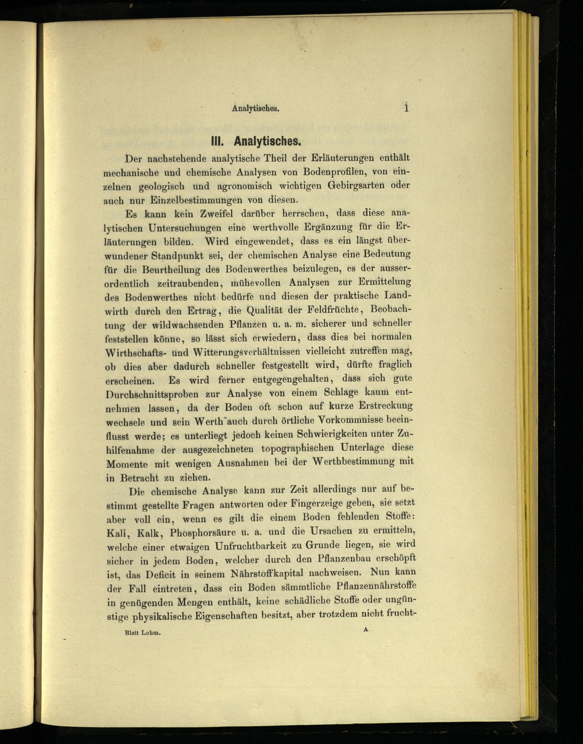 Der nachstehende analytische Theil der Erläuterungen enthält mechanische und chemische Analysen von Bodenprofilen, von einzelnen geologisch und agronomisch wichtigen Gebirgsarten oder auch nur Einzelbestimmungen von diesen.