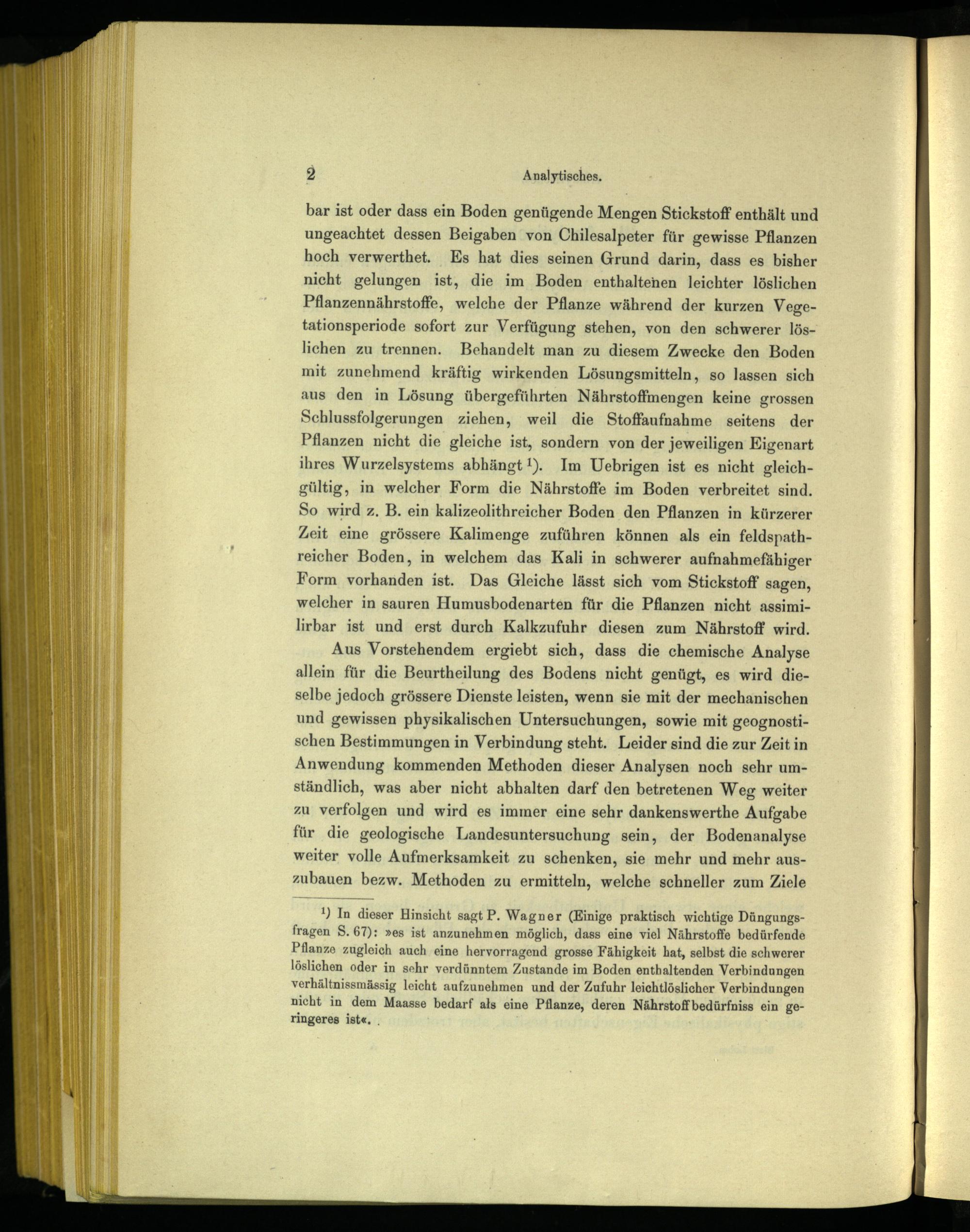 bar ist oder dass ein Boden genügende Mengen Stickstoff enthält und ungeachtet dessen Beigaben von Chilesalpeter für gewisse Pflanzen hoch verwerthet. Es hat dies seinen Grund darin, dass es bisher nicht gelungen ist, die im Boden enthaltenen leichter löslichen Pflanzennährstoffe, welche der Pflanze während der kurzen Vegetationsperiode sofort zur Verfügung stehen, von den schwerer löslichen zu trennen. Behandelt man zu diesem Zwecke den Boden mit zunehmend kräftig wirkenden Lösungsmitteln, so lassen sich aus den in Lösung übergeführten Nährstoffmengen keine grossen Schlussfolgerungen ziehen, weil die Stoffaufnahme seitens der Pflanzen nicht die gleiche ist, sondern von der jeweiligen Eigenart ihres Wurzelsystems abhängt!). Im Uebrigen ist es nicht gleichgültig, in welcher Form die Nährstoffe im Boden verbreitet sind. So wird z, B. ein kalizeolithreicher Boden den Pflanzen in kürzerer Zeit eine grössere Kalimenge zuführen können als ein feldspathreicher Boden, in welchem das Kali in schwerer aufnahmefähiger Form vorhanden ist. Das Gleiche lässt sich vom Stickstoff sagen, welcher in sauren Humusbodenarten für die Pflanzen nicht assimilirbar ist und erst durch Kalkzufuhr diesen zum Nährstoff wird.