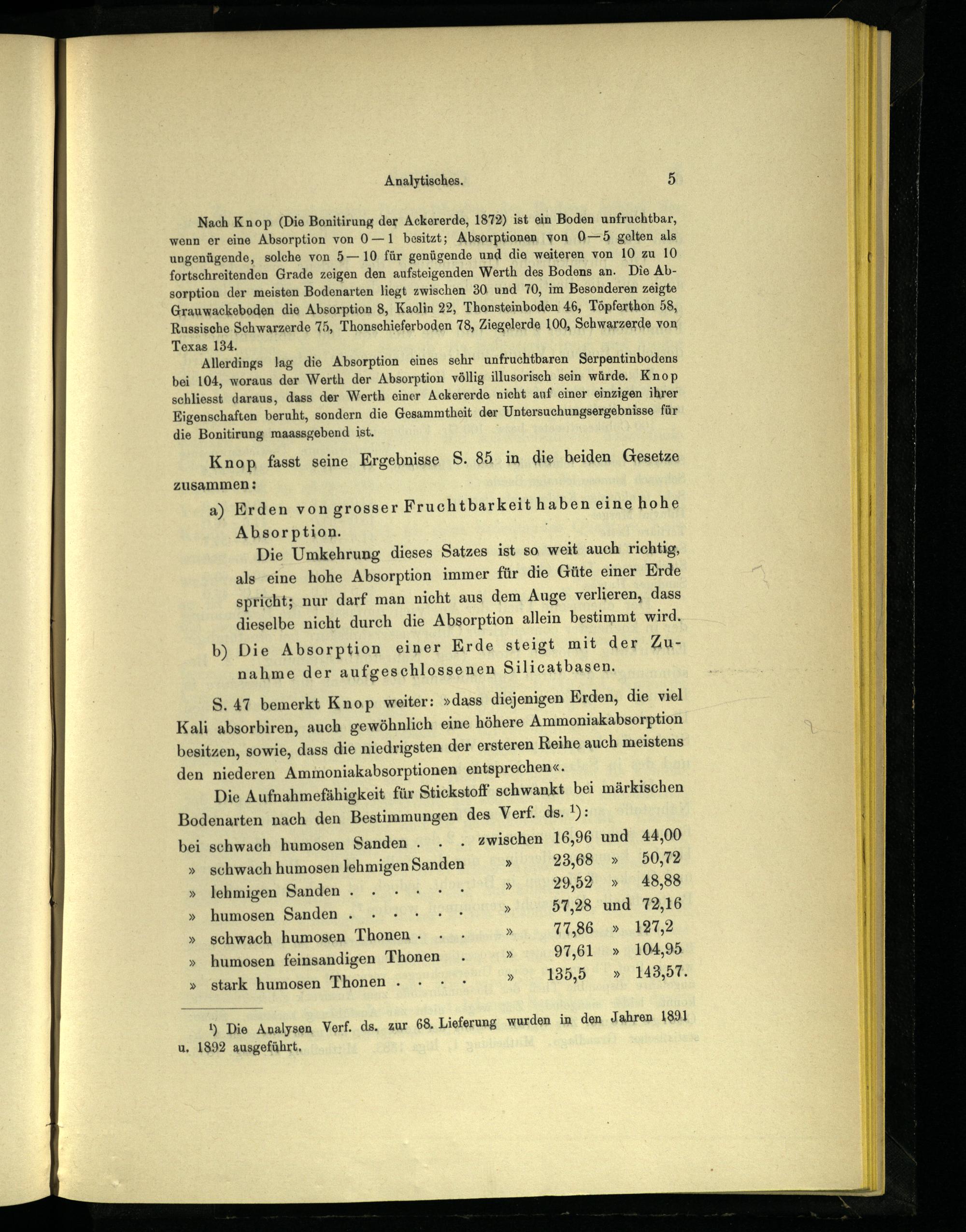 Allerdings lag die Absorption eines sehr unfruchtbaren Serpentinbodens bei 104, woraus der Werth der Absorption völlig illusorisch sein würde. Knop schliesst daraus, dass der Werth einer Ackererde nicht auf einer einzigen ihrer Eigenschaften beruht, sondern die Gesammtheit der Untersuchungsergebnisse für die Bonitirung maassgebend ist.