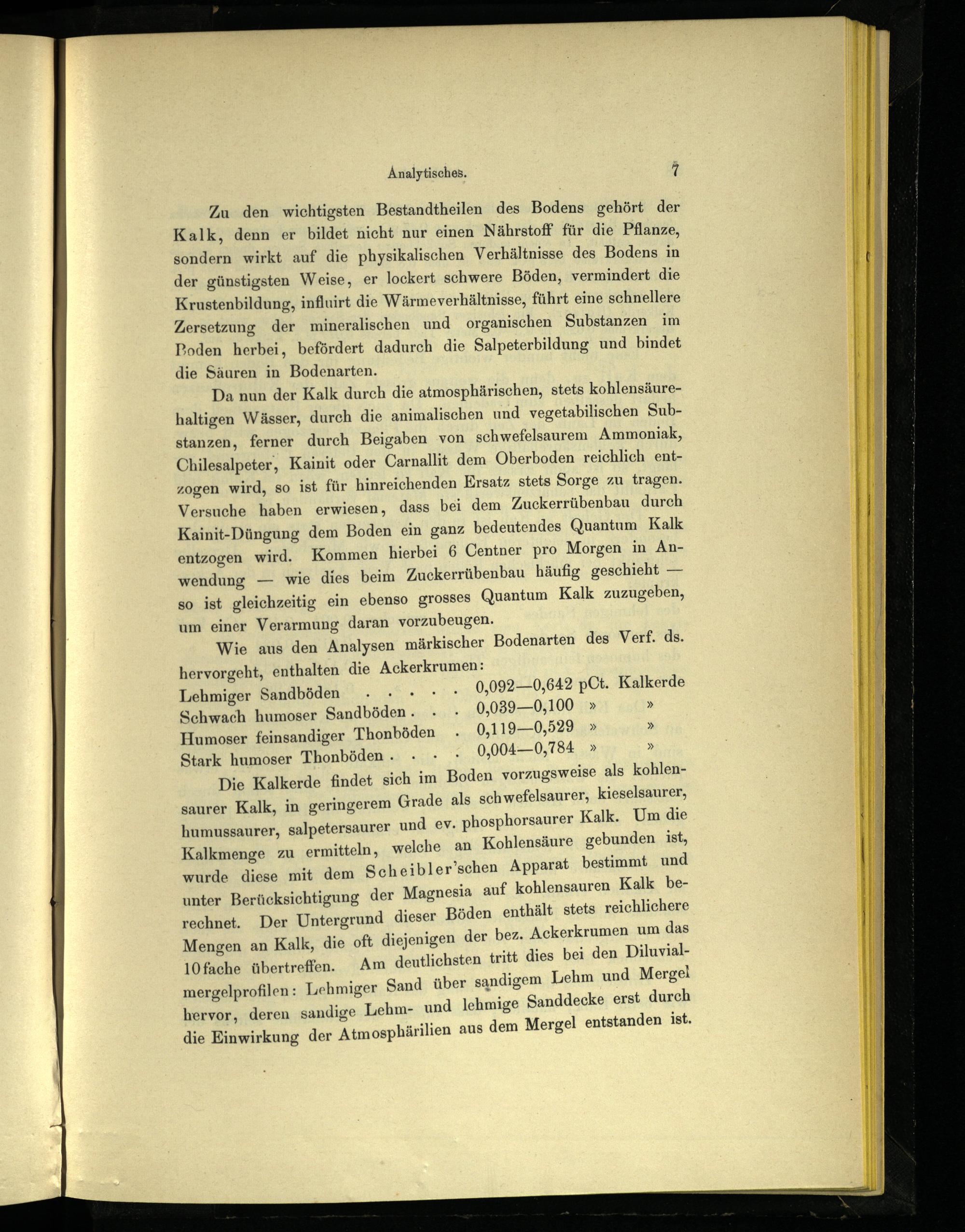 Zu den wichtigsten Bestandtheilen des Bodens gehört der Kalk, denn er bildet nicht nur einen Nährstoff für die Pflanze, sondern wirkt auf die physikalischen Verhältnisse des Bodens in der günstigsten Weise, er lockert schwere Böden, vermindert die Krustenbildung, influirt die Wärmeverhältnisse, führt eine schnellere Zersetzung der mineralischen und organischen Substanzen im 3oden herbei, befördert dadurch die Salpeterbildung und bindet die Säuren in Bodenarten.