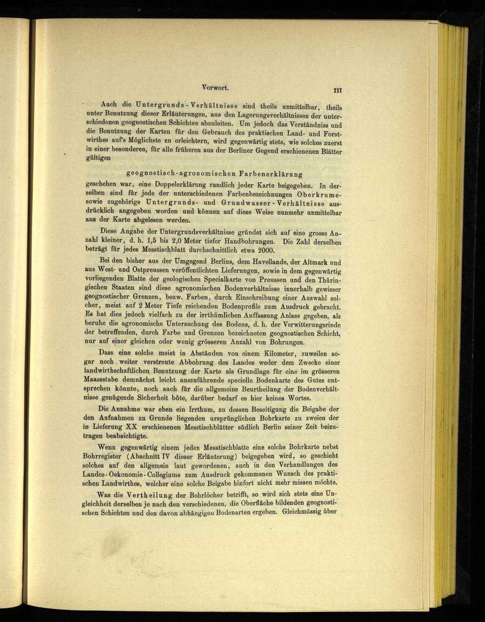 Bei den bisher aus der Umgegend Berlins, dem Havellande, der Altmark und aus West- und Ostpreussen veröffentlichten Lieferungen, sowie in dem gegenwärtig vorliegenden Blatte der geologischen Specialkarte von Preussen und den Thüringischen Staaten sind diese agronomischen Bodenverhältnisse innerhalb gewisser geognostischer Grenzen, bezw. Farben, durch Einschreibung einer Auswahl solcher, meist auf 2 Meter Tiefe reichenden Bodenprofile zum Ausdruck gebracht. Es hat dies jedoch vielfach zu der irrthümlichen Auffassung Anlass gegeben, als beruhe die agronomische Untersuchung des Bodens, d. h. der Verwitterungsrinde der betreffenden, durch Farbe und Grenzen bezeichneten geognostischen Schicht, nur auf einer gleichen oder wenig grösseren Anzahl von Bohrungen.