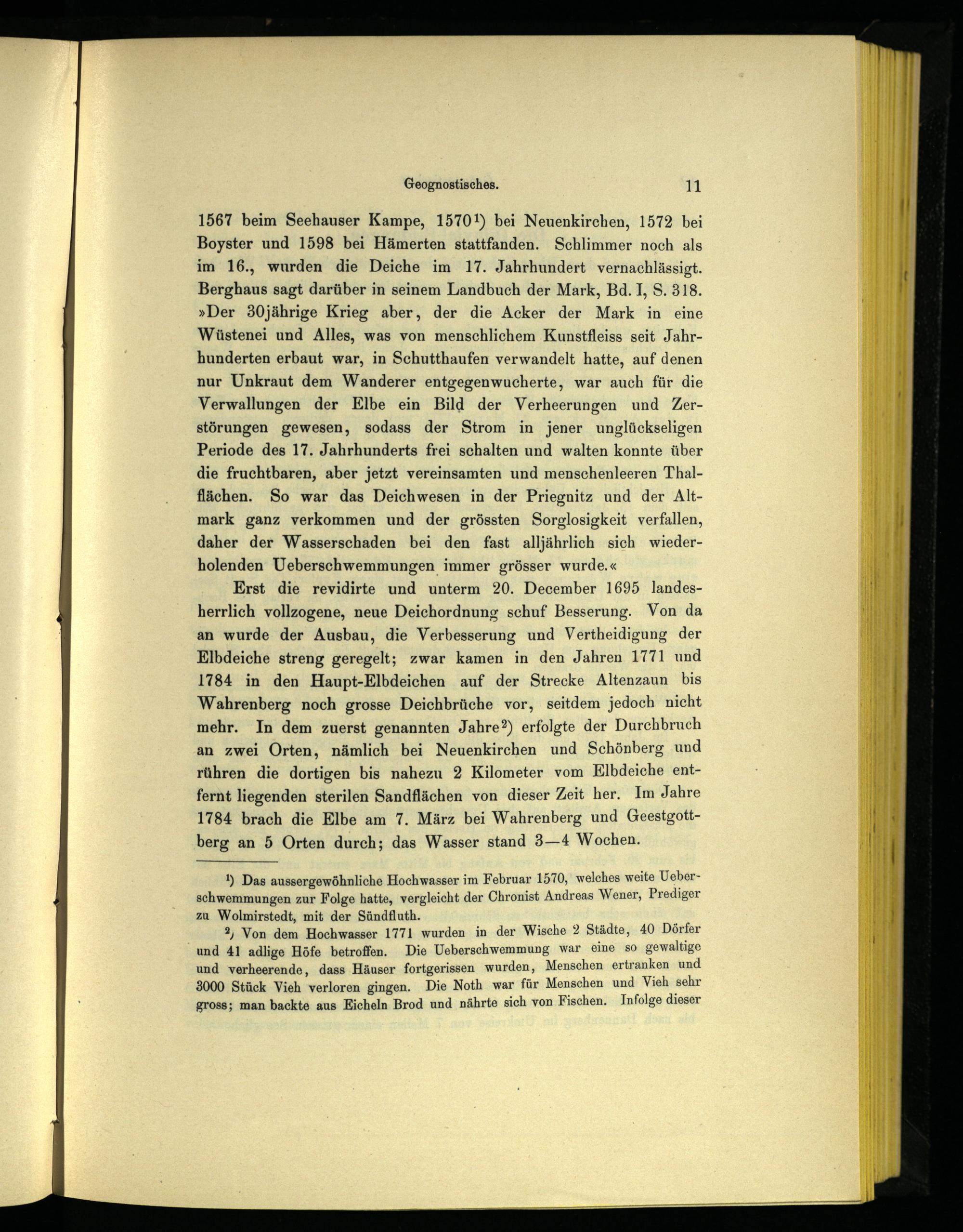 1567 beim Seehauser Kampe, 15701) bei Neuenkirchen, 1572 bei Boyster und 1598 bei Hämerten stattfanden. Schlimmer noch als im 16., wurden die Deiche im 17. Jahrhundert vernachlässigt. Berghaus sagt darüber in seinem Landbuch der Mark, Bd. I, S. 318. »Der 30jährige Krieg aber, der die Acker der Mark in eine Wüstenei und Alles, was von menschlichem Kunstfleiss seit Jahrhunderten erbaut war, in Schutthaufen verwandelt hatte, auf denen nur Unkraut dem Wanderer entgegenwucherte, war auch für die Verwallungen der Elbe ein Bild der Verheerungen und Zerstörungen gewesen, sodass der Strom in jener unglückseligen Periode des 17. Jahrhunderts frei schalten und walten konnte über die fruchtbaren, aber jetzt vereinsamten und menschenleeren Thalflächen. So war das Deichwesen in der Priegnitz und der Altmark ganz verkommen und der grössten Sorglosigkeit verfallen, daher der Wasserschaden bei den fast alljährlich sich wiederholenden Ueberschwemmungen immer grösser wurde.«