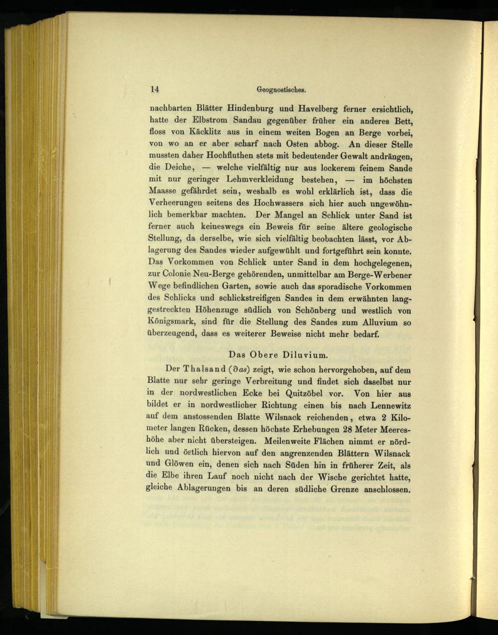 nachbarten Blätter Hindenburg und Havelberg ferner ersichtlich, hatte der Elbstrom Sandau gegenüber früher ein anderes Bett, floss von Käcklitz aus in einem weiten Bogen an Berge vorbei, von wo an er aber scharf nach Osten abbog. An dieser Stelle mussten daher Hochfluthen stets mit bedeutender Gewalt andrängen, die Deiche,— welche vielfältig nur aus lockerem feinem Sande mit nur geringer Lehmverkleidung bestehen,— im höchsten Maasse gefährdet sein, weshalb es wohl erklärlich ist, dass die Verheerungen seitens des Hochwassers sich hier auch ungewöhnlich bemerkbar machten. Der Mangel an Schlick unter Sand ist ferner auch keineswegs ein Beweis für seine ältere geologische Stellung, da derselbe, wie sich vielfältig beobachten lässt, vor Ablagerung des Sandes wieder aufgewühlt und fortgeführt sein konnte. Das Vorkommen von Schlick unter Sand in dem hochgelegenen, zur Colonie Neu-Berge gehörenden, unmittelbar am Berge-Werbener Wege befindlichen Garten, sowie auch das sporadische Vorkommen des Schlicks und schlickstreifigen Sandes in dem erwähnten langgestreckten Höhenzuge südlich von Schönberg und westlich von Königsmark, sind für die Stellung des Sandes zum Alluvium so überzeugend, dass es weiterer Beweise nicht mehr bedarf.