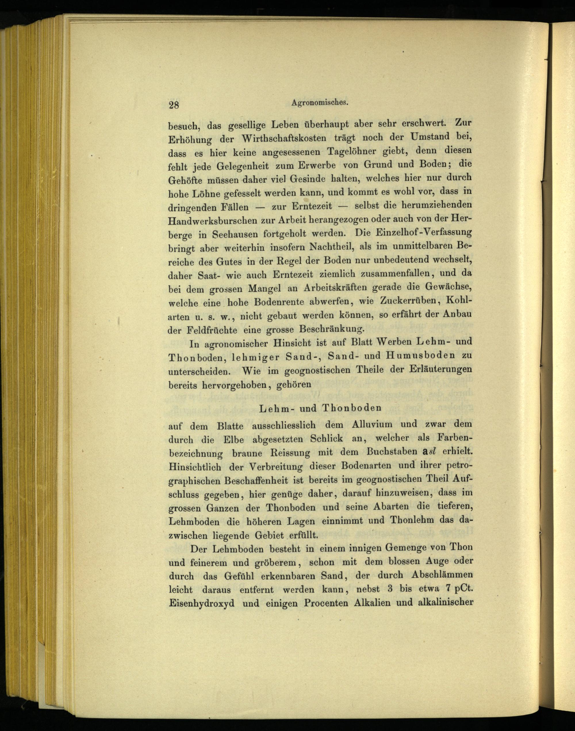 Der Lehmboden besteht in einem innigen Gemenge von Thon und feinerem und gröberem, schon mit dem blossen Auge oder durch das Gefühl erkennbaren Sand, der durch Abschlämmen leicht daraus entfernt werden kann, nebst 3 bis etwa 7 pCt. Eisenhydroxyd und einigen Procenten Alkalien und alkalinischer