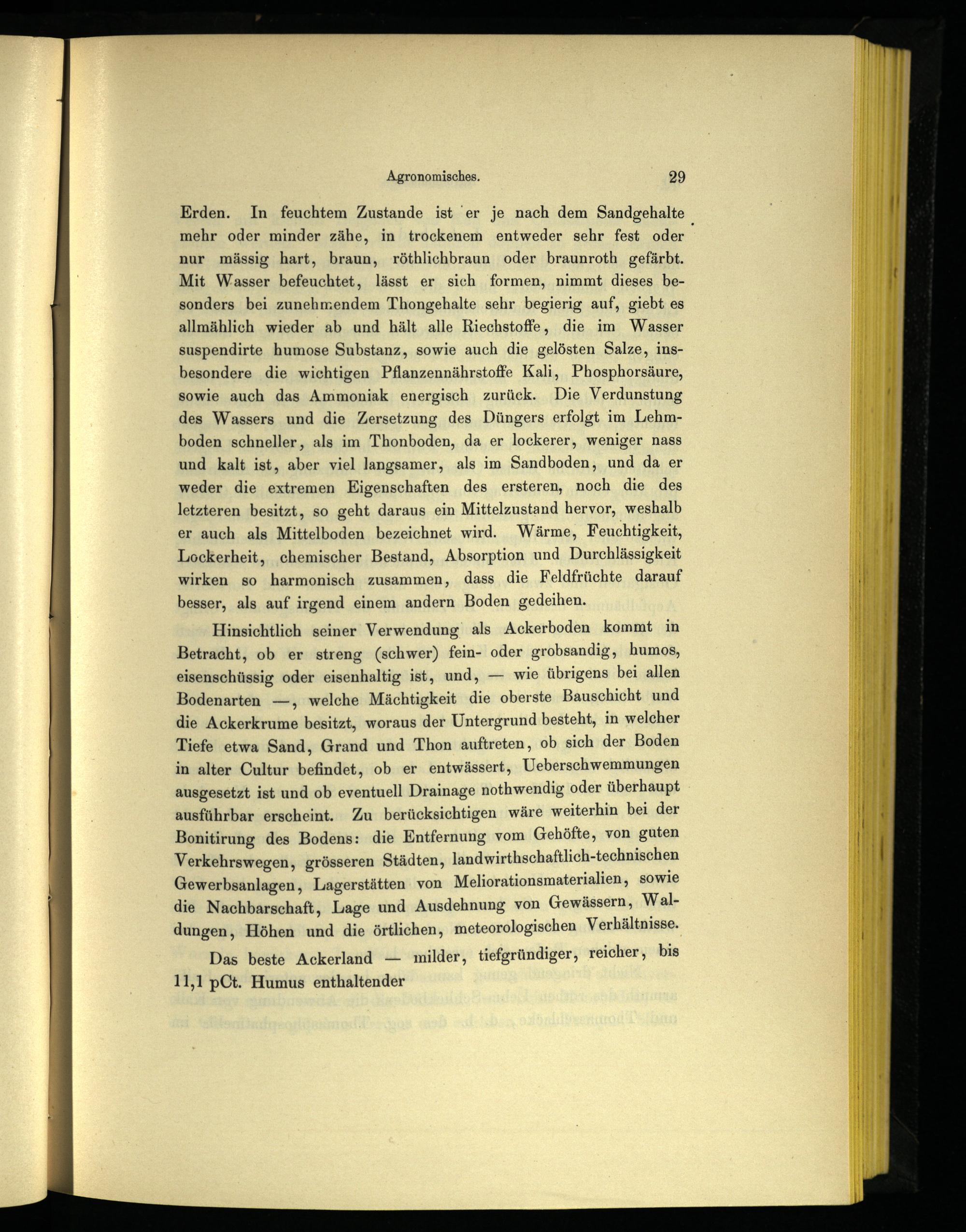 Erden. In feuchtem Zustande ist er je nach dem Sandgehalte mehr oder minder zähe, in trockenem entweder sehr fest oder nur mässig hart, braun, röthlichbraun oder braunroth gefärbt. Mit Wasser befeuchtet, lässt er sich formen, nimmt dieses besonders bei zunehmendem Thongehalte sehr begierig auf, giebt es allmählich wieder ab und hält alle Riechstoffe, die im Wasser suspendirte humose Substanz, sowie auch die gelösten Salze, insbesondere die wichtigen Pflanzennährstoffe Kali, Phosphorsäure, sowie auch das Ammoniak energisch zurück. Die Verdunstung des Wassers und die Zersetzung des Düngers erfolgt im Lehmboden schneller, als im Thonboden, da er lockerer, weniger nass und kalt ist, aber viel langsamer, als im Sandboden, und da er weder die extremen Eigenschaften des ersteren, noch die des letzteren besitzt, so geht daraus ein Mittelzustand hervor, weshalb er auch als Mittelboden bezeichnet wird. Wärme, Feuchtigkeit, Lockerheit, chemischer Bestand, Absorption und Durchlässigkeit wirken so harmonisch zusammen, dass die Feldfrüchte darauf besser, als auf irgend einem andern Boden gedeihen.