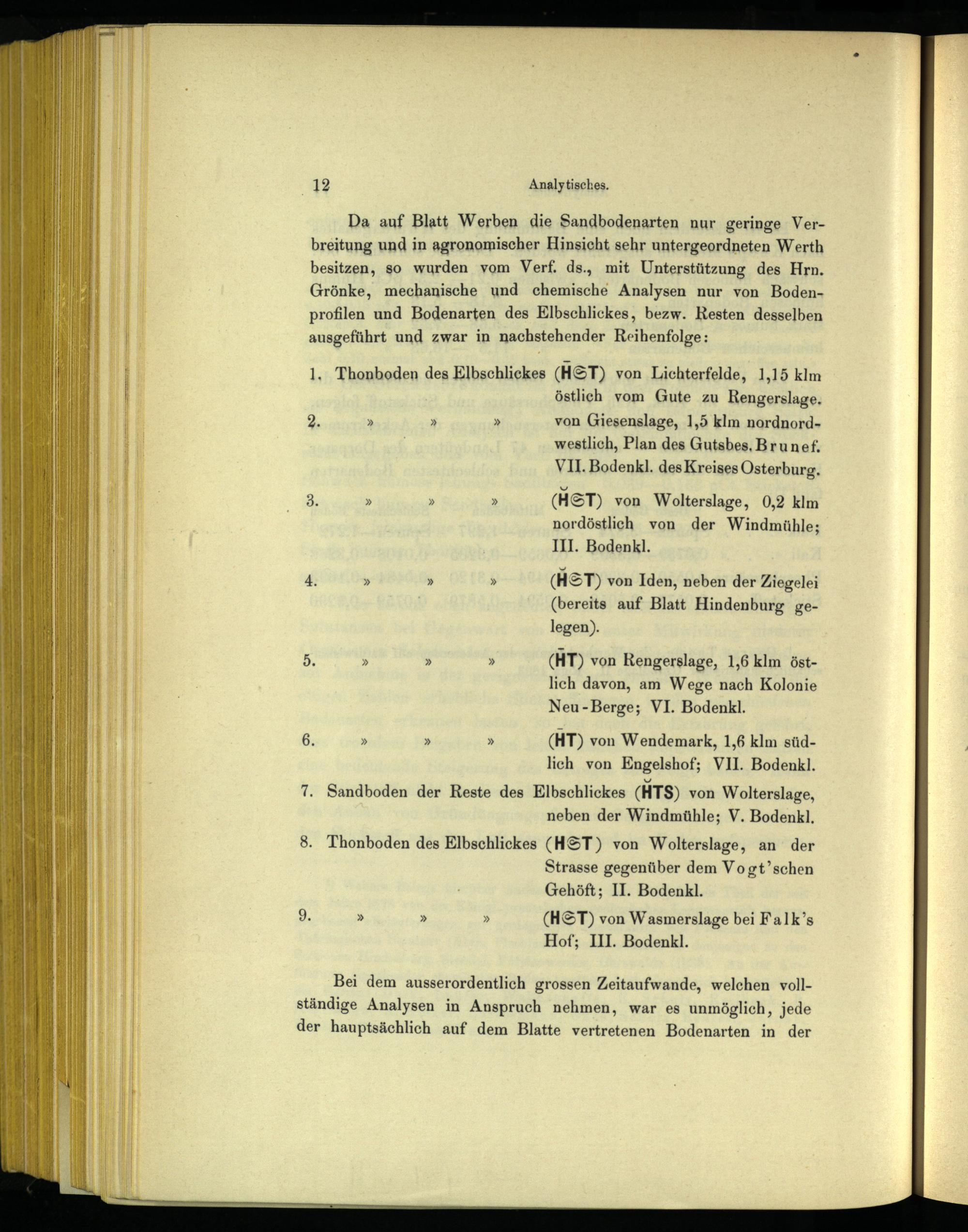 Da auf Blatt Werben die Sandbodenarten nur geringe Verbreitung und in agronomischer Hinsicht sehr untergeordneten Werth besitzen, so wurden vom Verf. ds., mit Unterstützung des Hrn. Grönke, mechanische und chemische Analysen nur von Bodenprofilen und Bodenarten des Elbschlickes, bezw. Resten desselben ausgeführt und zwar in nachstehender Reihenfolge: