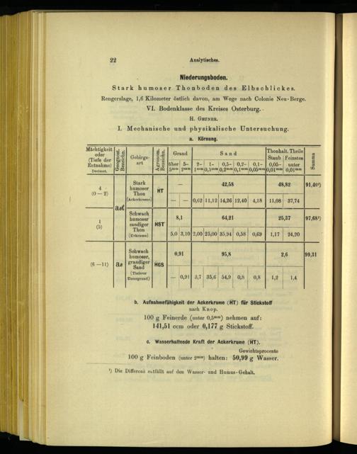 Niederungsboden. Stark humoser Thonboden des Elbschlickes. Rengerslage, 1,6 Kilometer östlich davon, am Wege nach Colonie Neu-Berge. VI. Bodenklasse des Kreises Osterburg. H. GRUNER. I. Mechanische und physikalische Untersuchung.