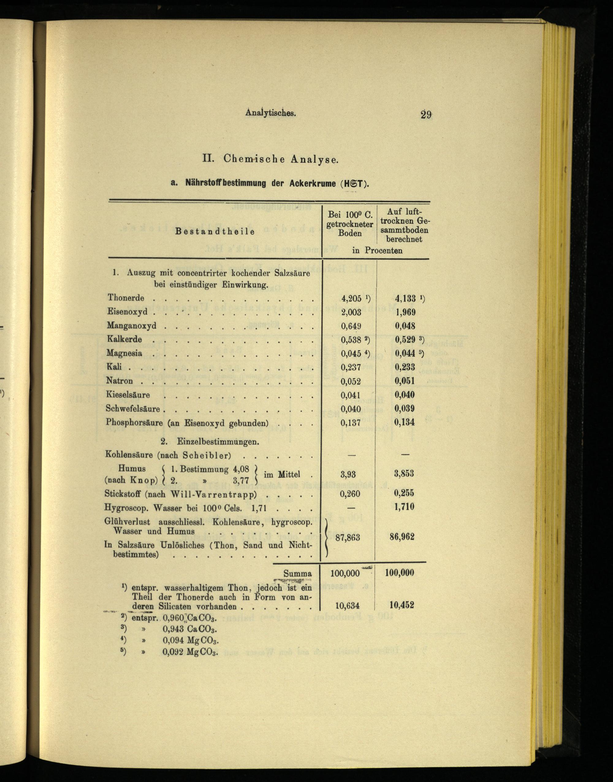 2. KEinzelbestimmungen. Kohlensäure(nach Scheibler) Humus 1. Bestimmung 4,08 (nach Knop)( 2.» 3,77 Stickstoff(nach Will-Varrentrapp) Hygroscop. Wasser bei 100° Cels. 1,71